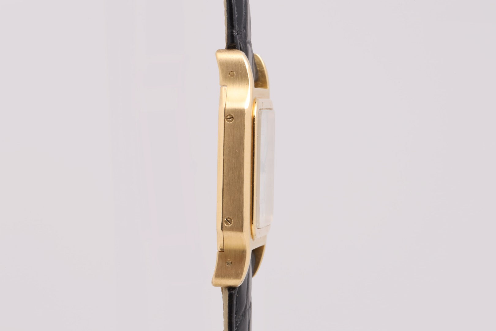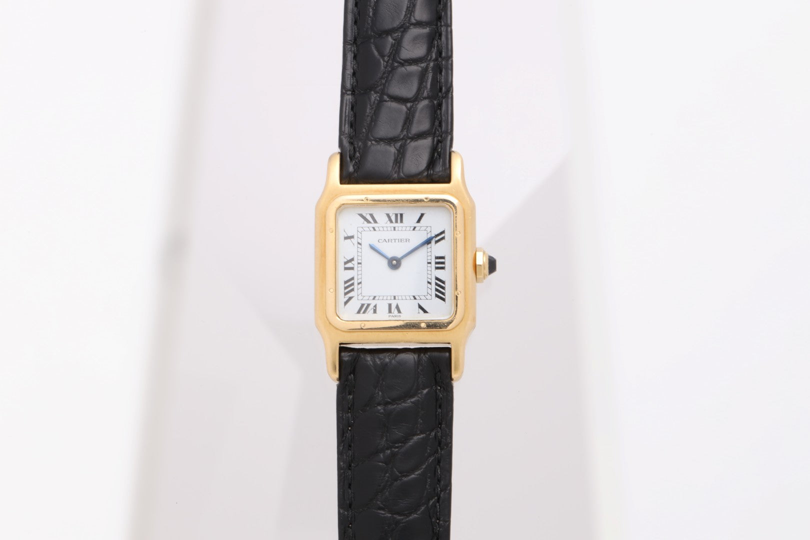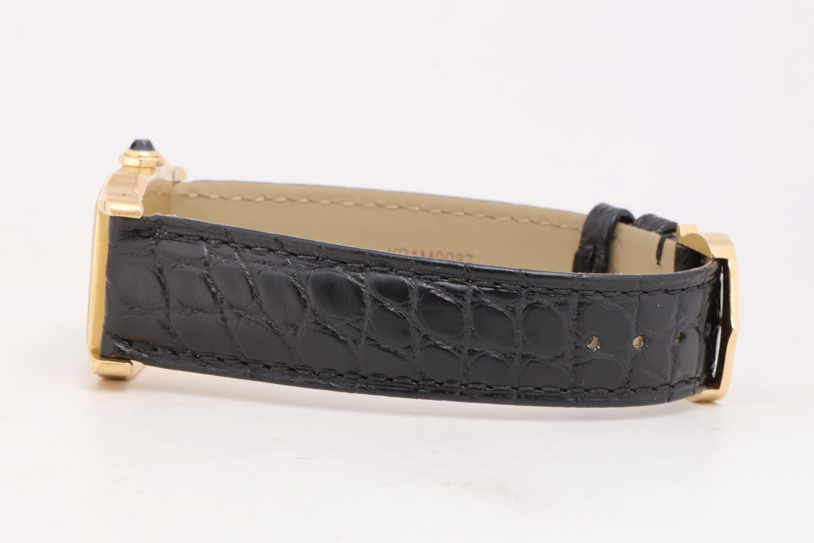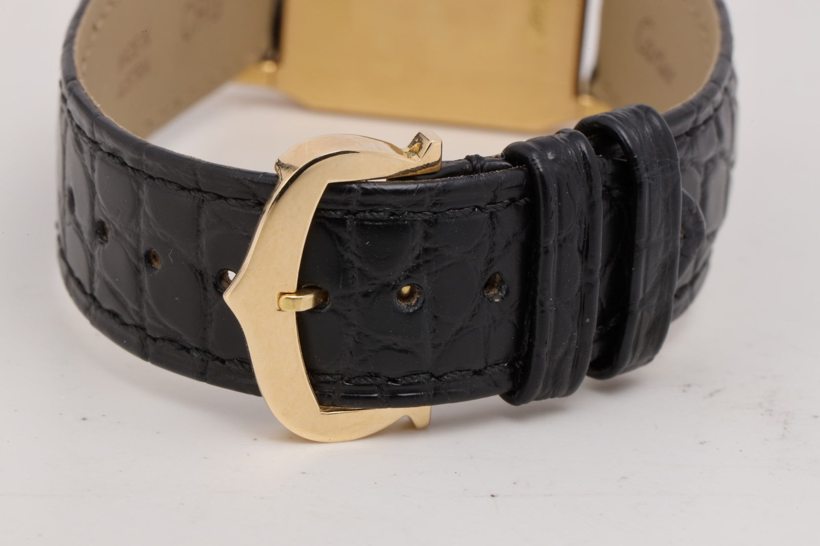 This manual-wind Santos-Dumont remains in very good condition (8/10), showing only light wear consistent with careful use. It features a 25mm 18k gold case, a black leather strap with tang buckle, and a manually wound movement performing accurately at +12 seconds per day. With its graceful lines and enduring design, this piece embodies Cartier’s legacy as the “jeweler of kings and the king of jewelers.” A distinguished addition to any fine collection.