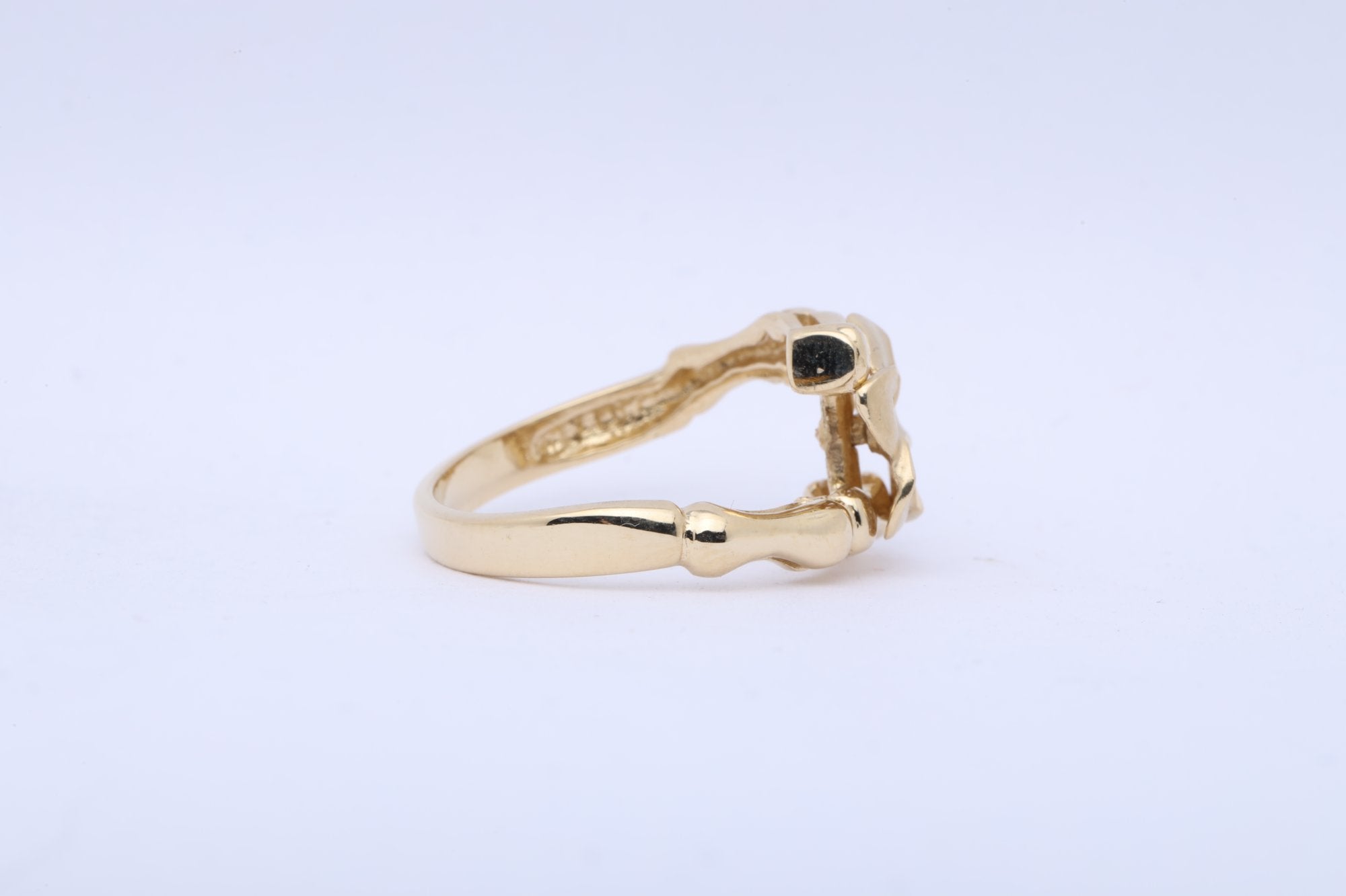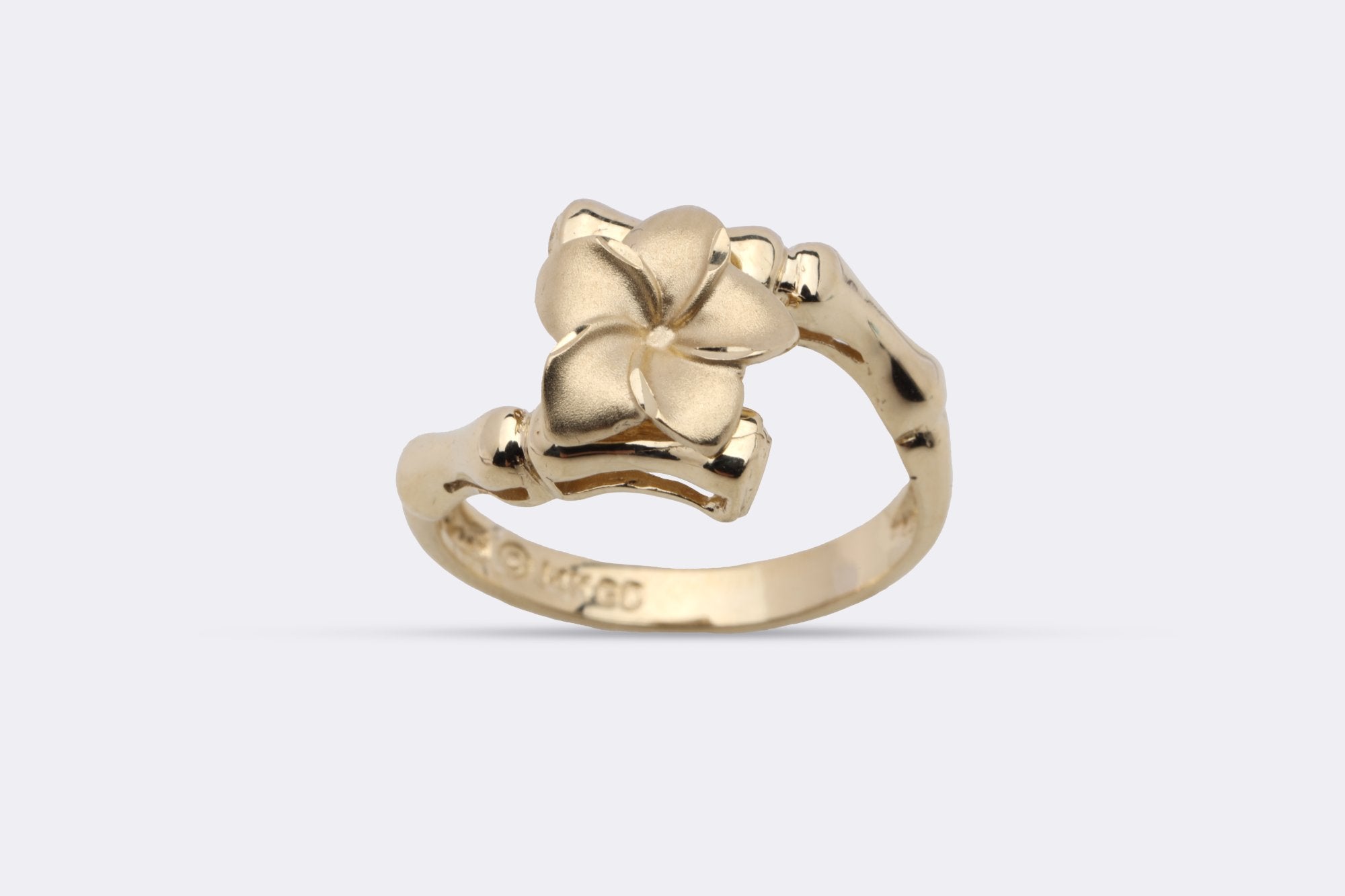 This unique ring features a beautiful plumeria flower and bamboo design, crafted from 14k yellow gold. The ring size is 6.75 and it is not resizable. The ring measures 10.30mm - 22.90mm in width and 4.60mm in thickness.