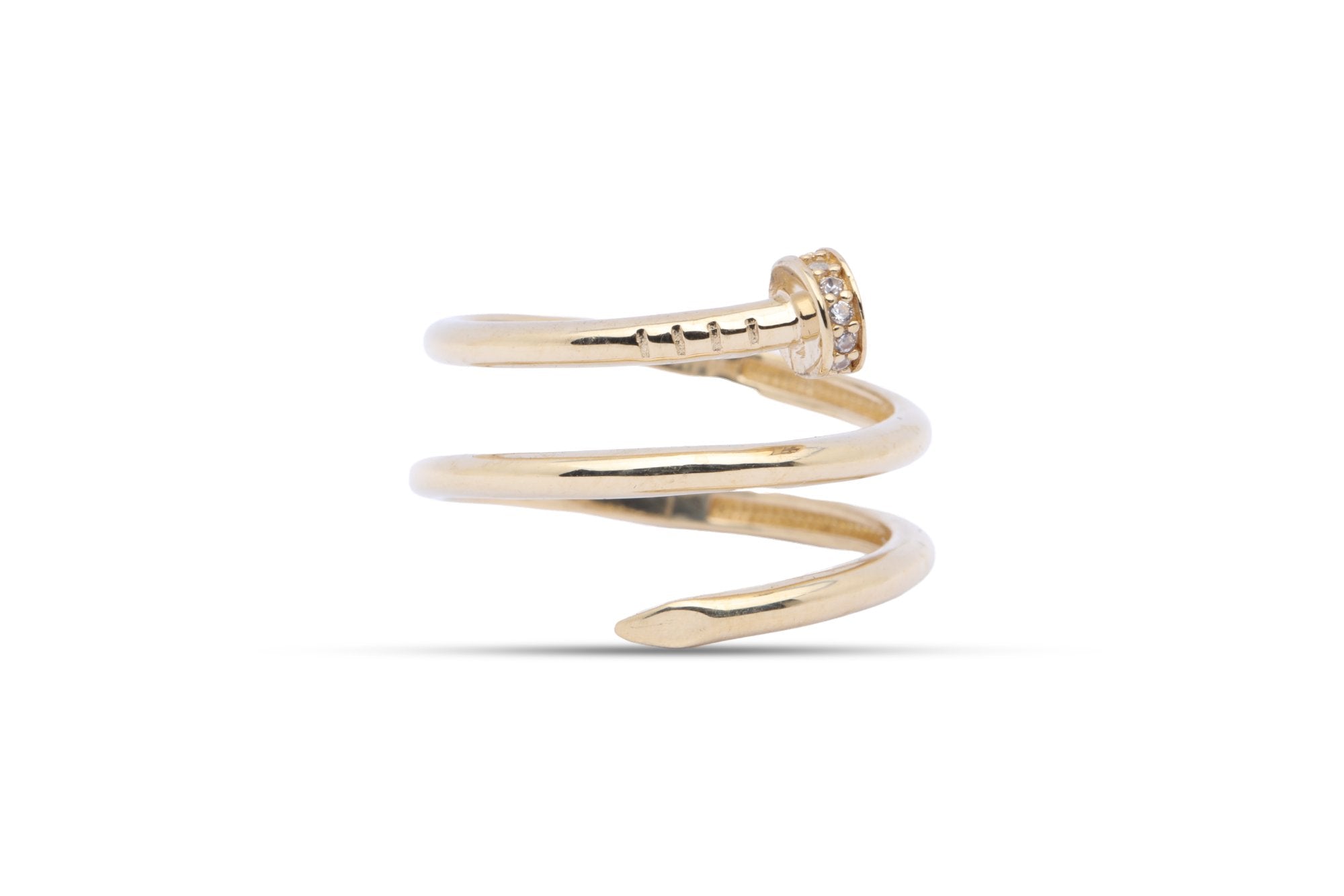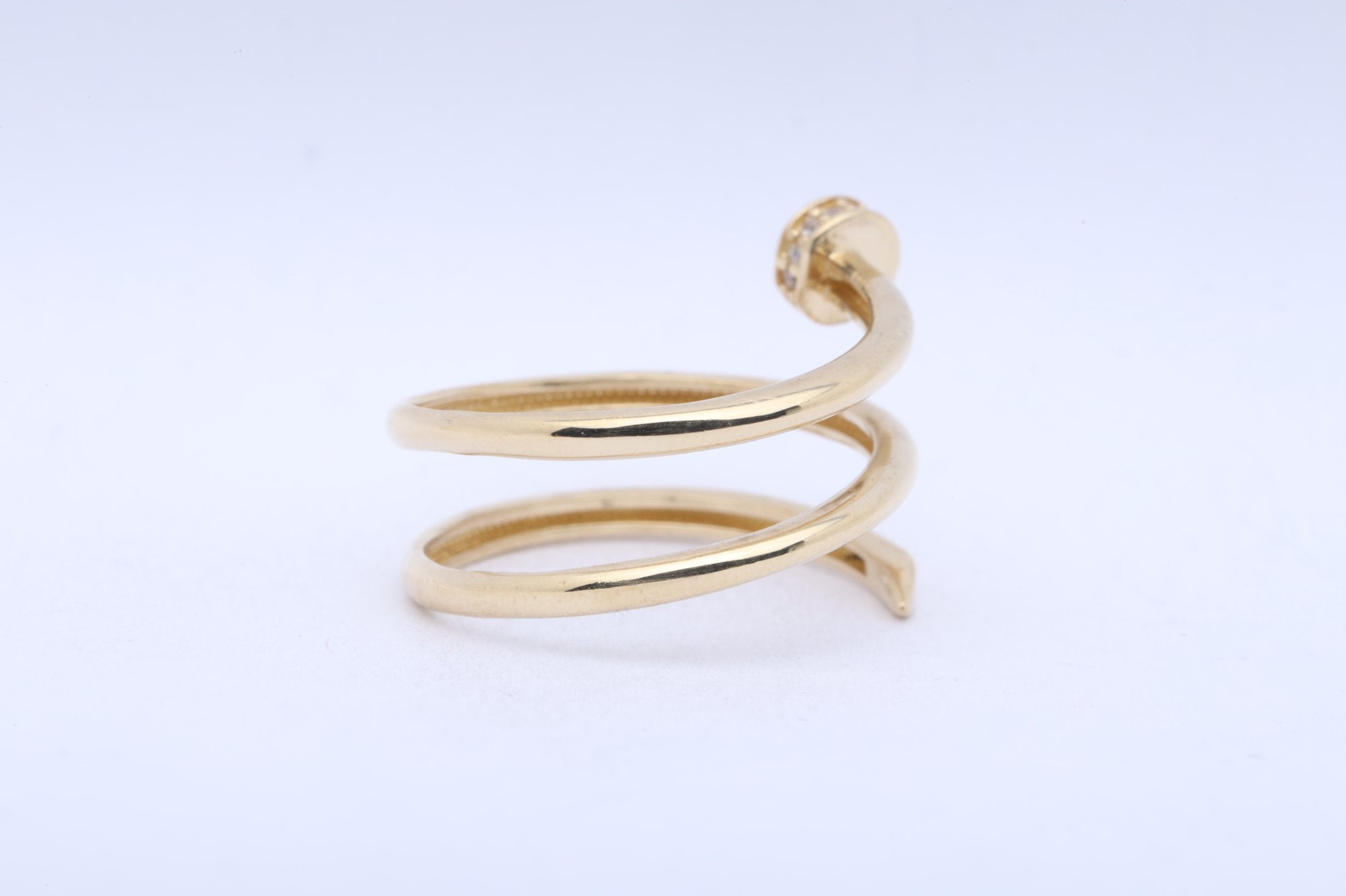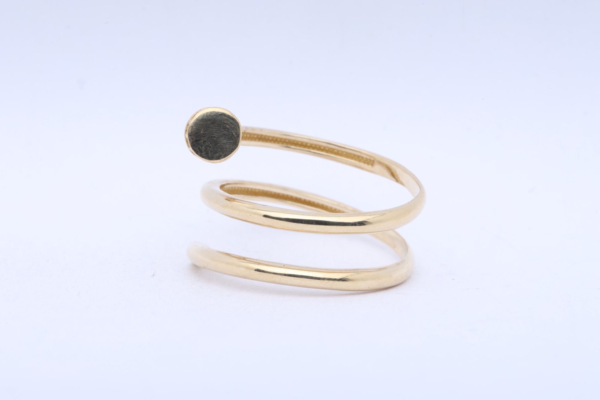 This unique ring, crafted from yellow gold, features a distinctive spiral nail wrap design. The ring's width measures 14.70mm and its thickness is 5.00mm, making it a substantial piece that is sure to draw attention.