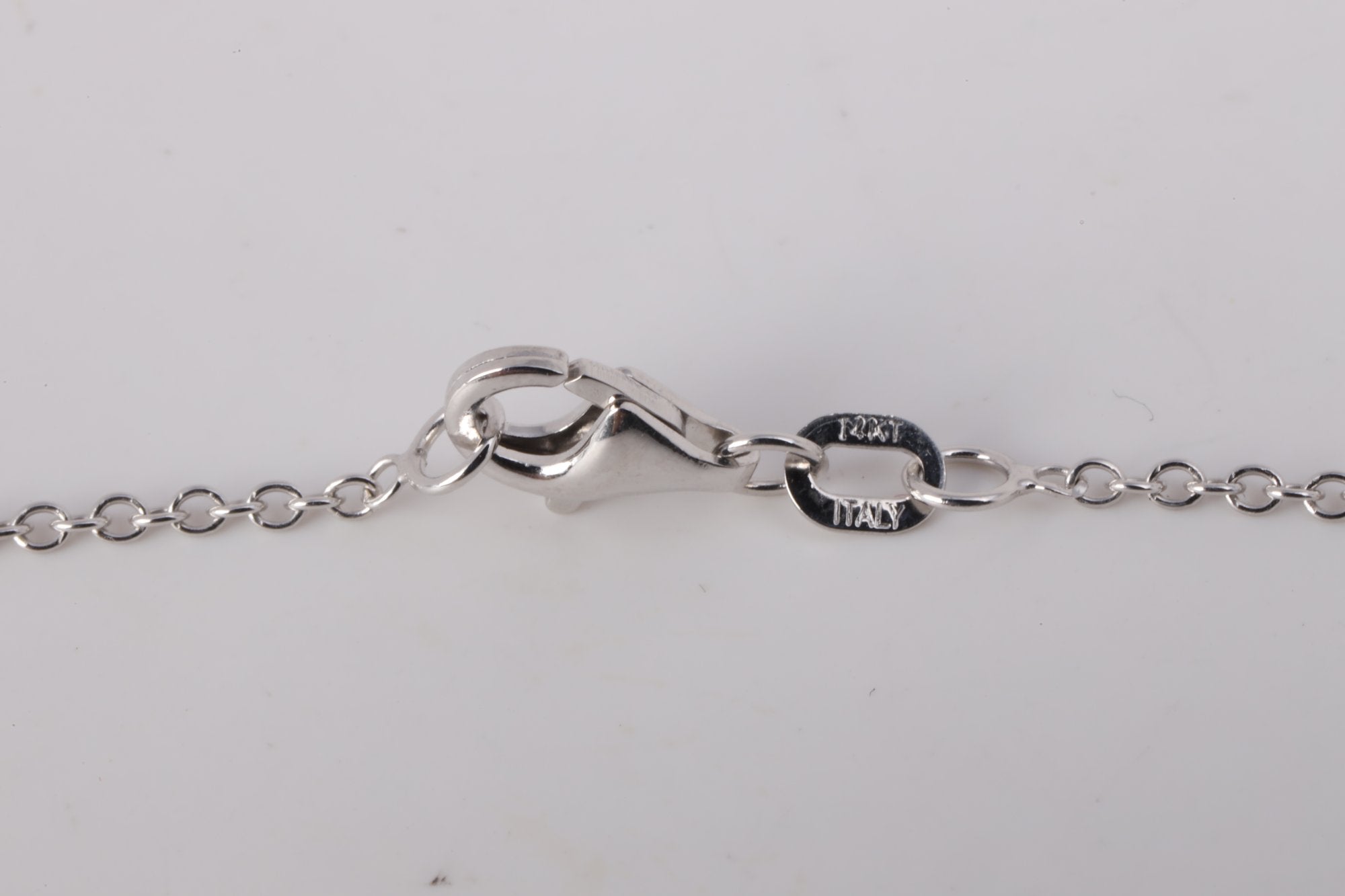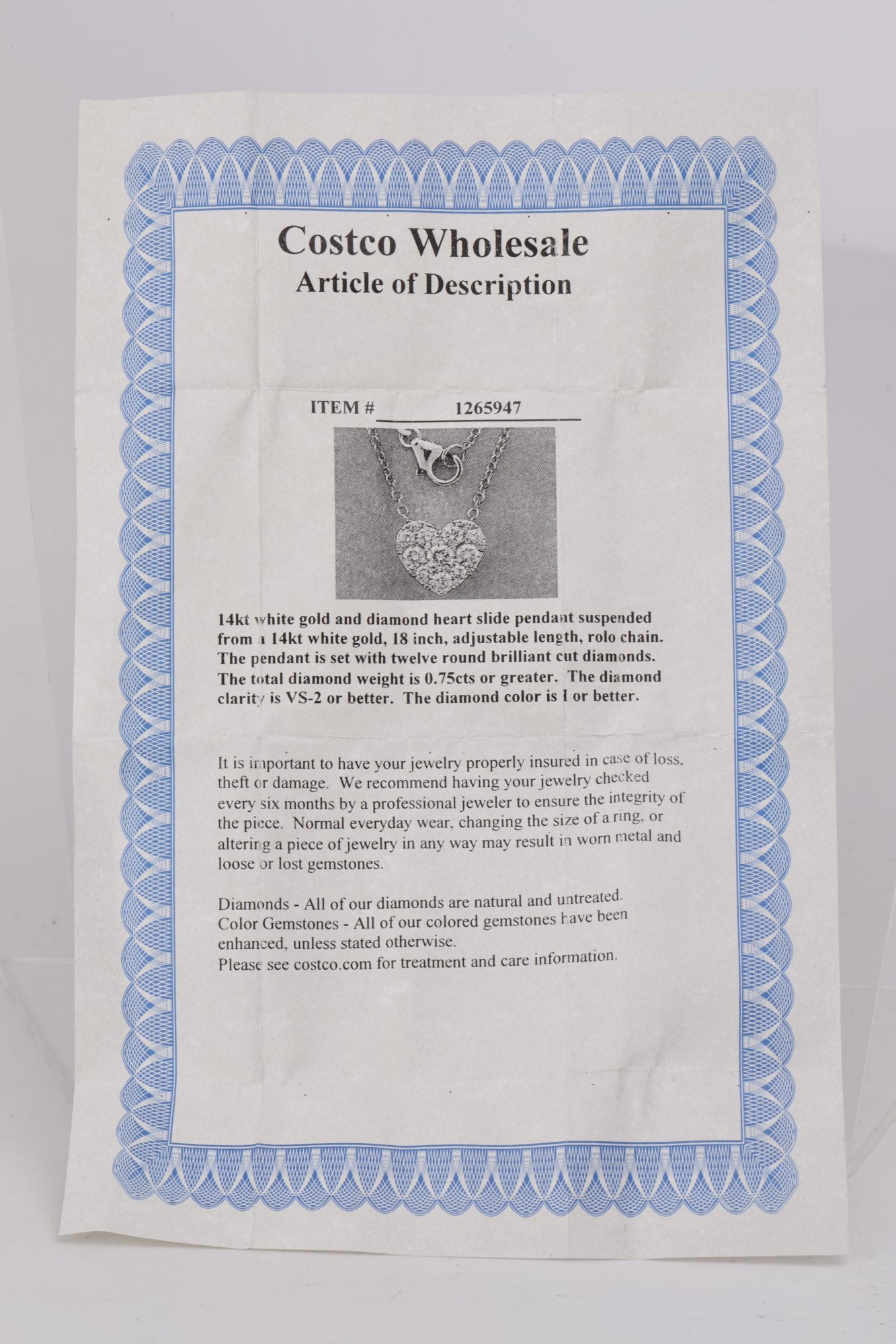 This elegant necklace is a timeless piece, crafted from 14k white gold. The heart pendant is adorned with 12 round brilliant diamonds, totaling 0.75ctw. The diamonds are near white in color and have very small spots for clarity. The necklace is 18 inches in length, with a width of 11.00mm and a thickness of 4.80mm.