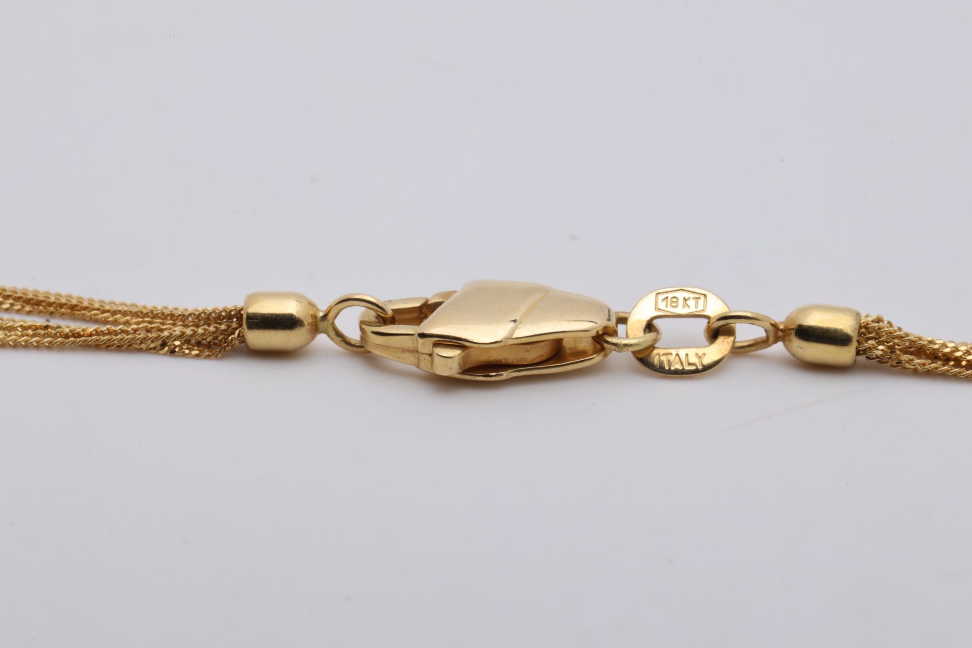 This elegant necklace is a timeless piece, crafted from 18k yellow gold. The necklace features a multi-strand design, adding a touch of sophistication to any outfit. The shiny finish of the gold strands catches the light beautifully, making this piece a standout addition to any jewelry collection.