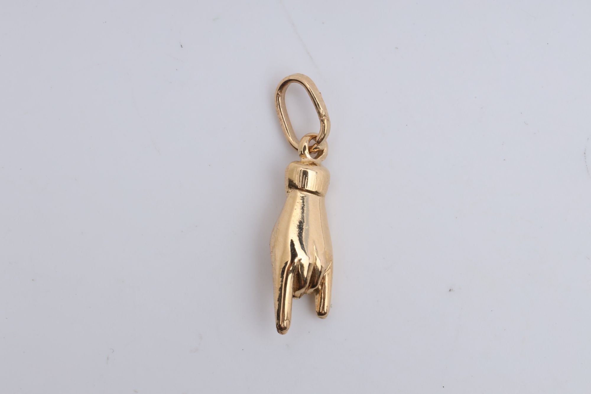 This charm pendant, crafted from 18k yellow gold, showcases the iconic Mano Cornuto, an Italian symbol of protection. The pendant is unbranded, focusing solely on the craftsmanship and design of the piece.