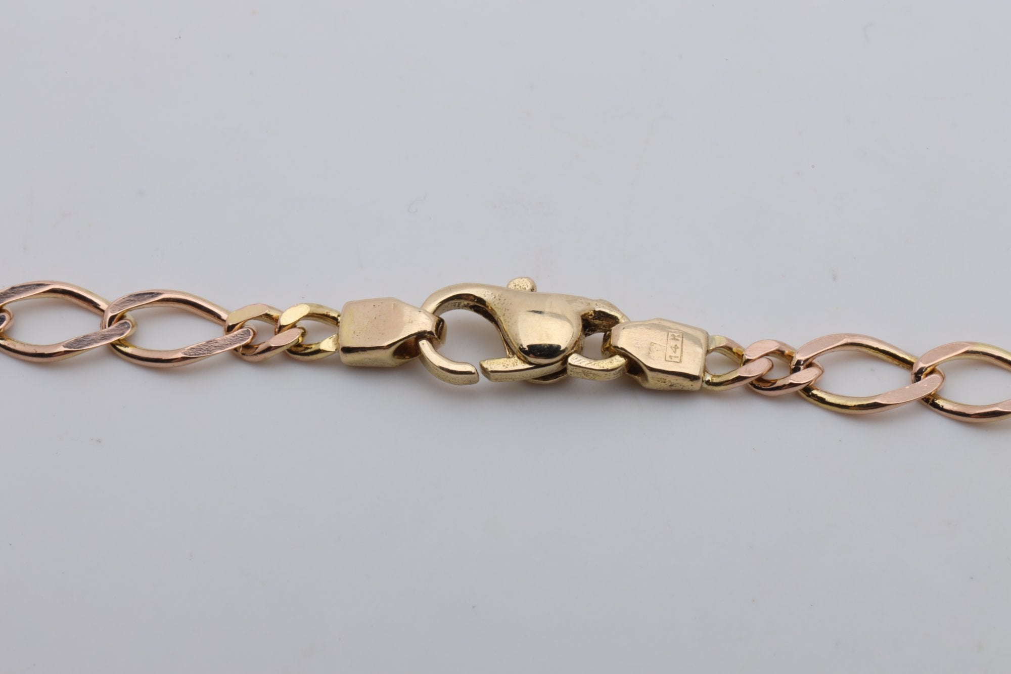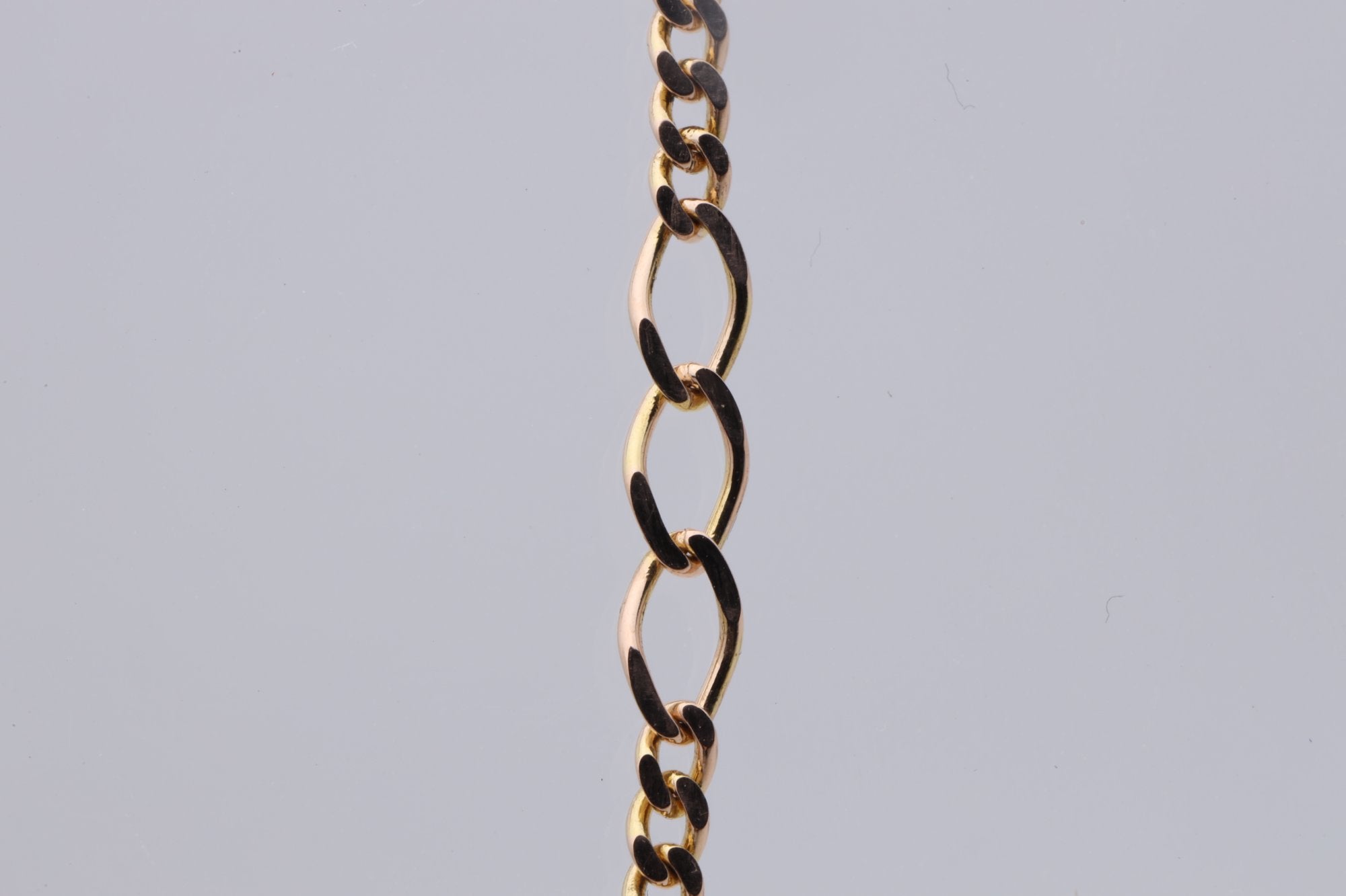 This 20'' Figaro chain is a classic piece of jewelry, crafted from yellow gold. The chain features a secure lobster clasp and is marked with the stamp '14k'.