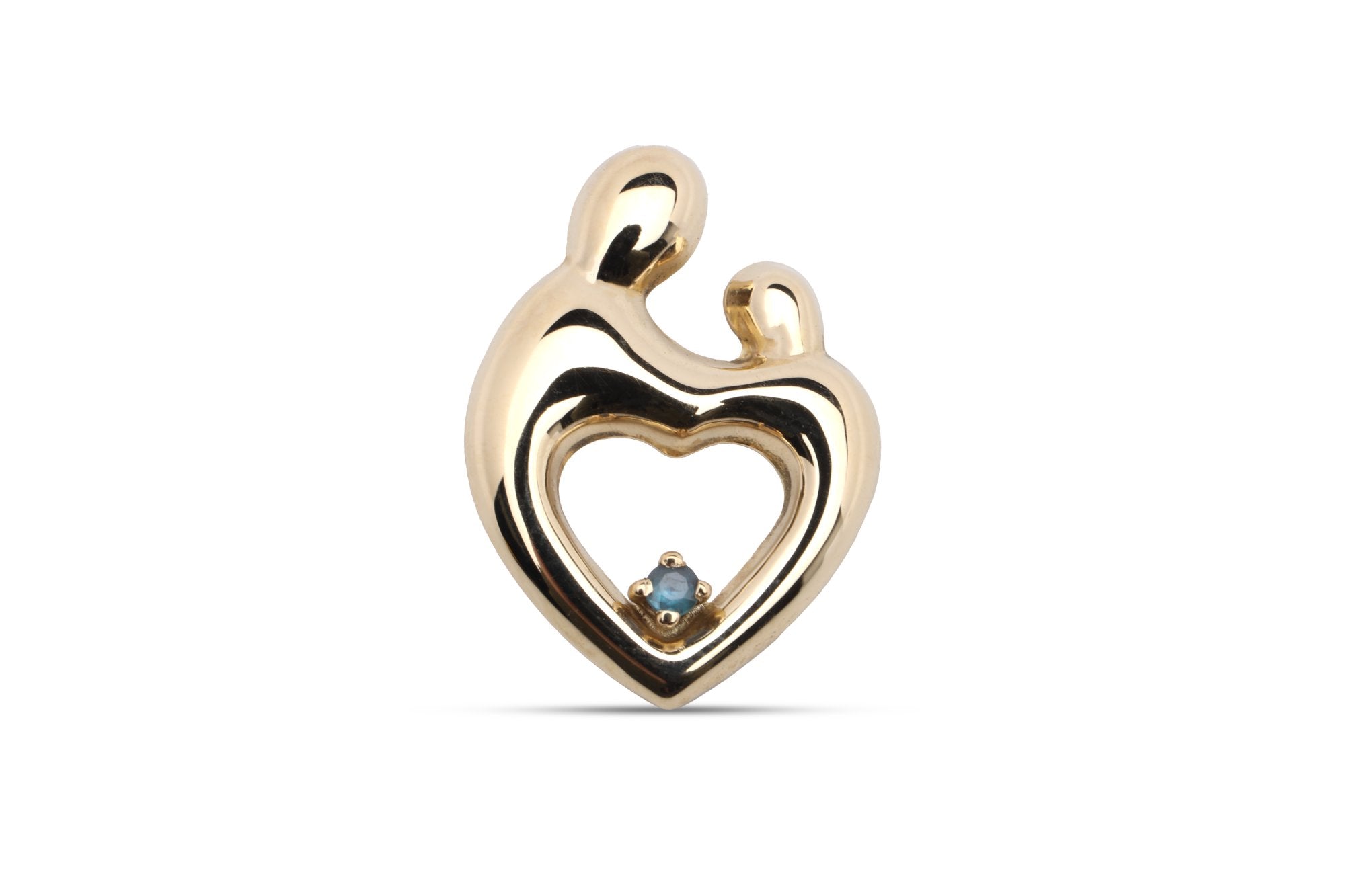 This exquisite pendant by Janel Russell is part of the The Original Design collection. Crafted from 14k yellow gold, it features a beautiful mother and child motif, adorned with a round brilliant cut sapphire.