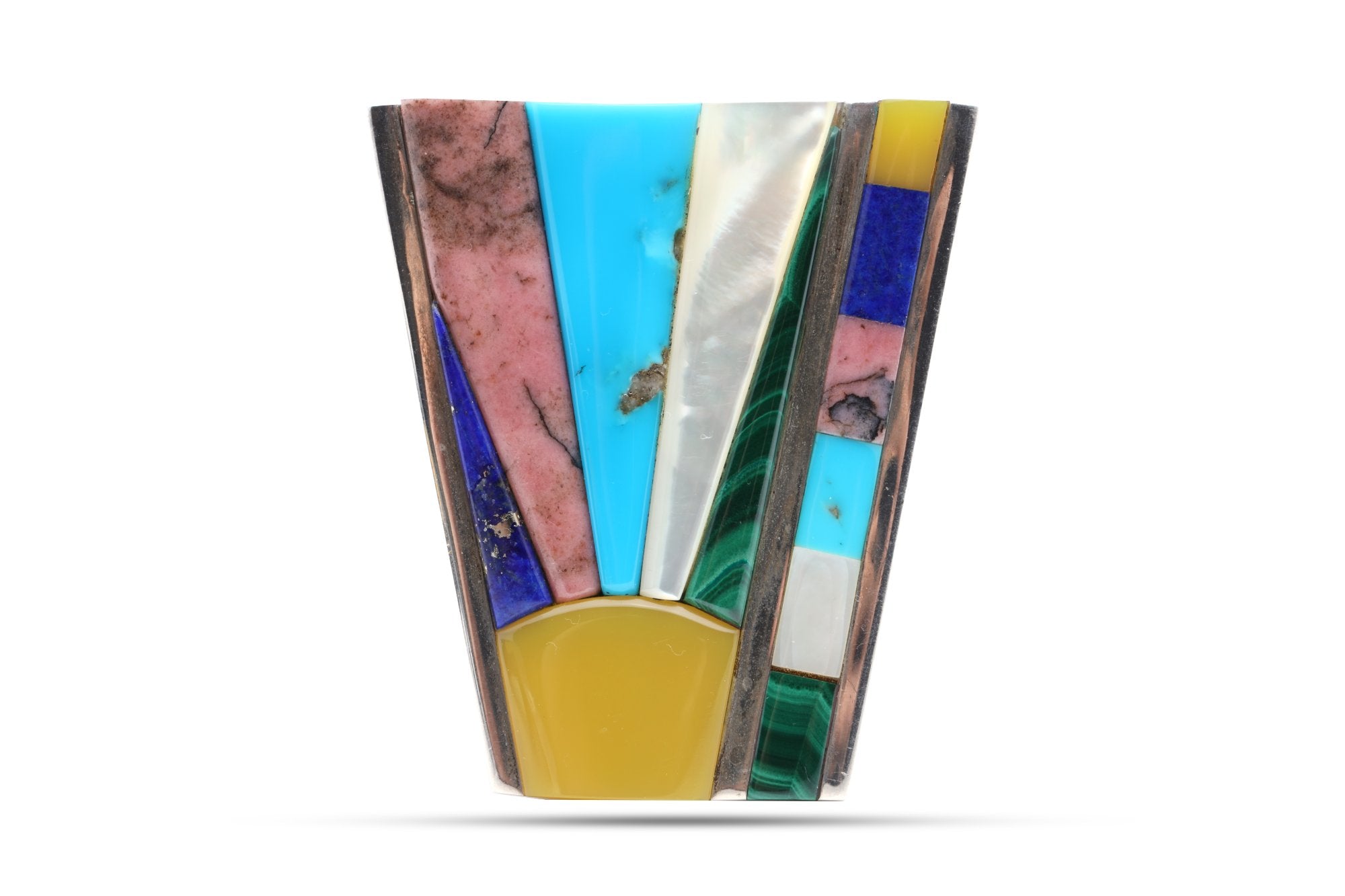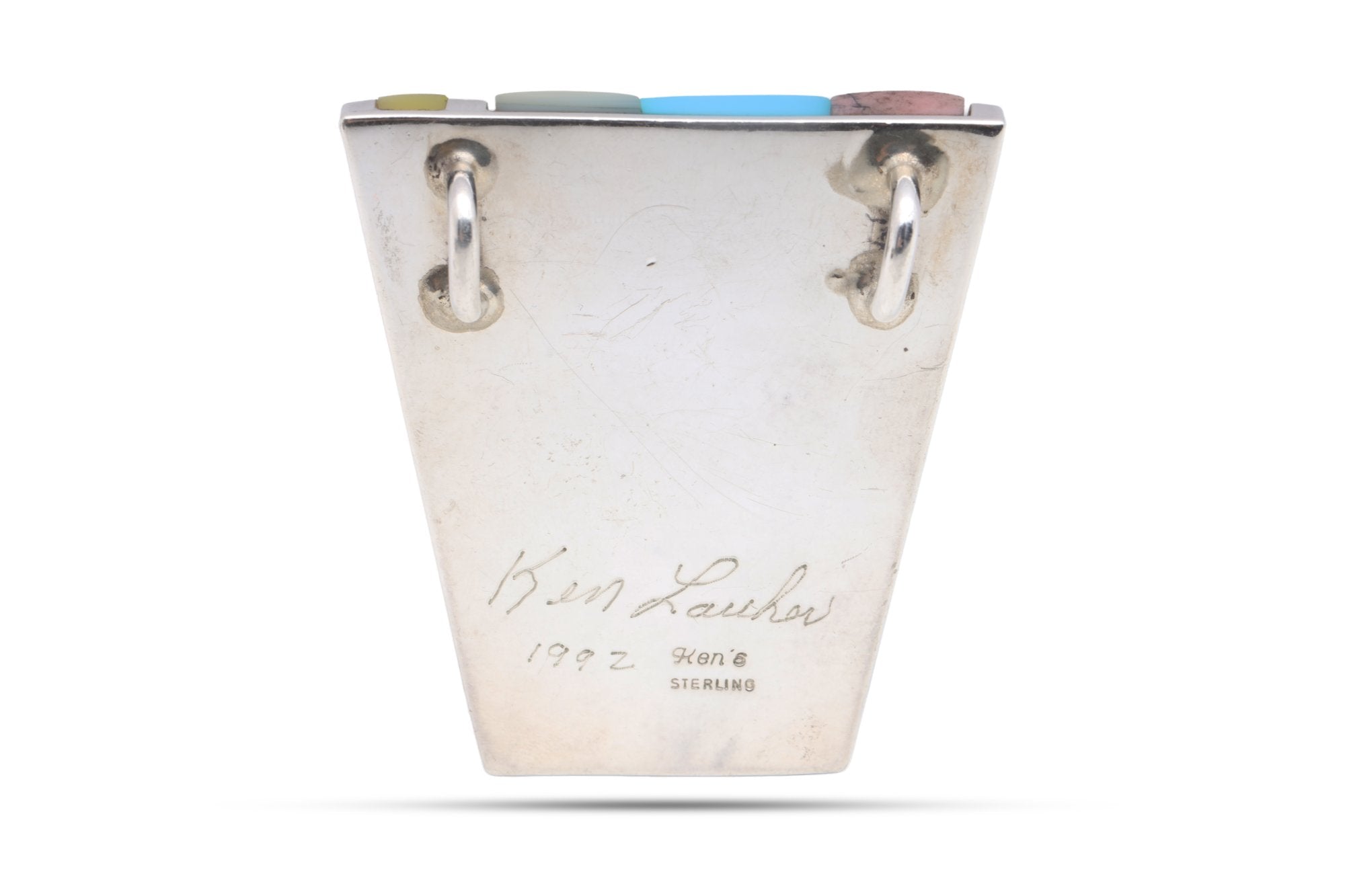 This unique piece is a sterling silver pendant with a multi-stone inlay. The pendant, which is not part of any specific collection, is a testament to the craftsmanship of its maker. The inlay features twelve mixed gemstones, adding pops of color to the sterling silver setting.