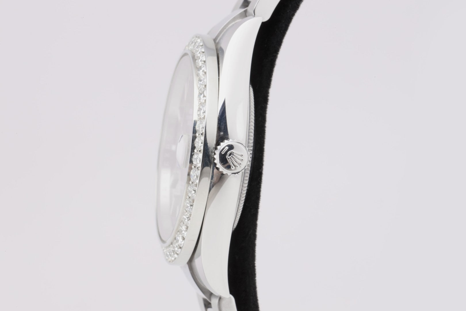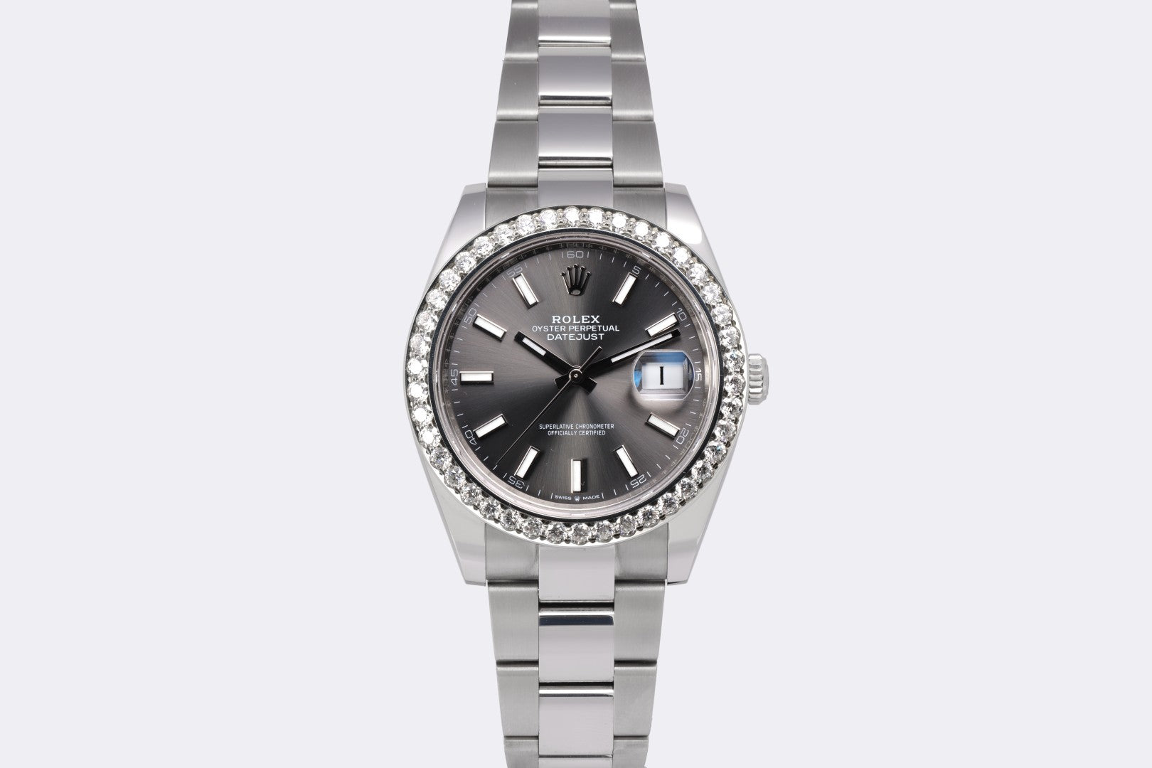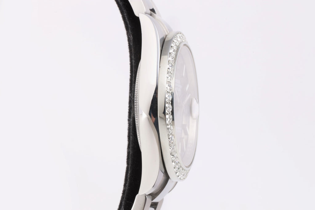This Rolex Datejust 126300 offers the perfect blend of modern Rolex engineering and bold, attention-grabbing style. The 41mm Oystersteel case delivers strong wrist presence, while the sleek smooth bezel has been upgraded with an aftermarket diamond-set bezel that adds brilliant sparkle without compromising Rolex’s iconic design language.