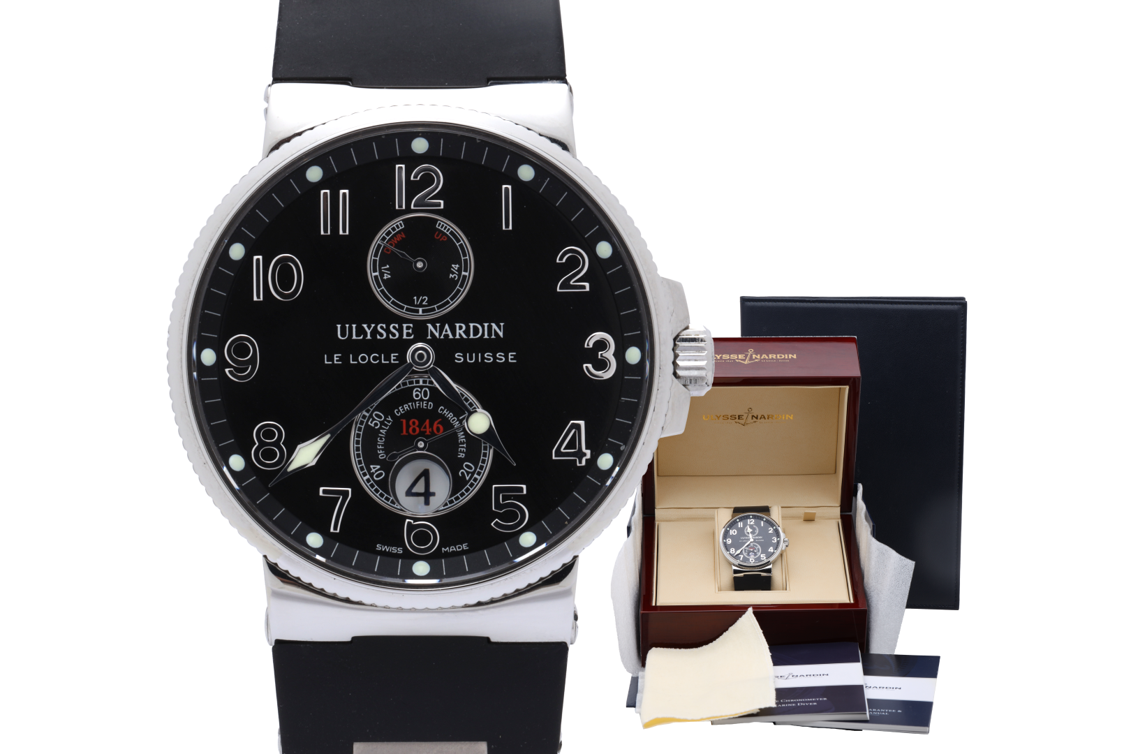 A robust yet refined Ulysse Nardin Maxi Marine built for sporty elegance and everyday reliability. Crafted in Switzerland, this men’s watch features a 40.5mm stainless steel case with a fixed bezel and sapphire crystal, paired with a black rubber two-piece strap secured by a butterfly clasp. Powering the watch is the automatic Ulysse Nardin caliber UN-26 (based on ETA 2892), offering a 42-hour power reserve and running at approximately -5 seconds per day. The watch has passed a pressure test up to 5 bar and fits wrists up to 6.5".