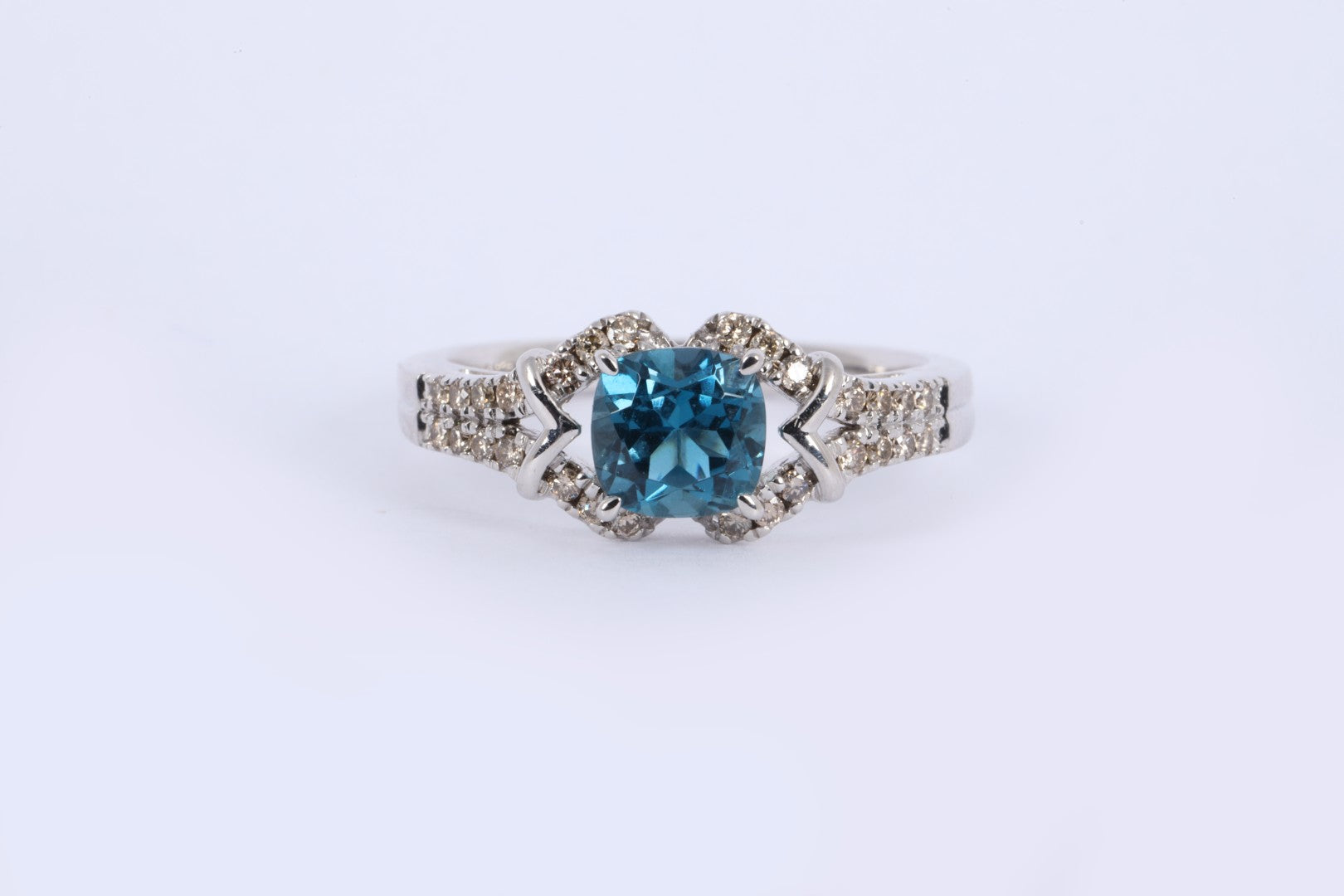 This Le Vian ring showcases the brand’s signature blend of bold color and luxurious design. Crafted in 14k white gold, it features a captivating 0.84 carat cushion-cut blue topaz at its center, radiating a cool, ocean-inspired brilliance. Surrounding the gemstone are 28 round brilliant cut chocolate diamonds totaling 0.50 carats, offering a rich contrast that enhances the vivid blue. A perfect fusion of elegance and drama, this piece is ideal for those who appreciate distinctive fine jewelry.