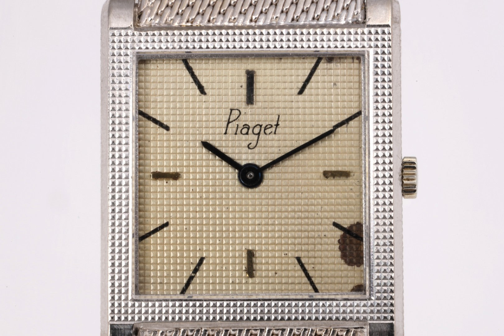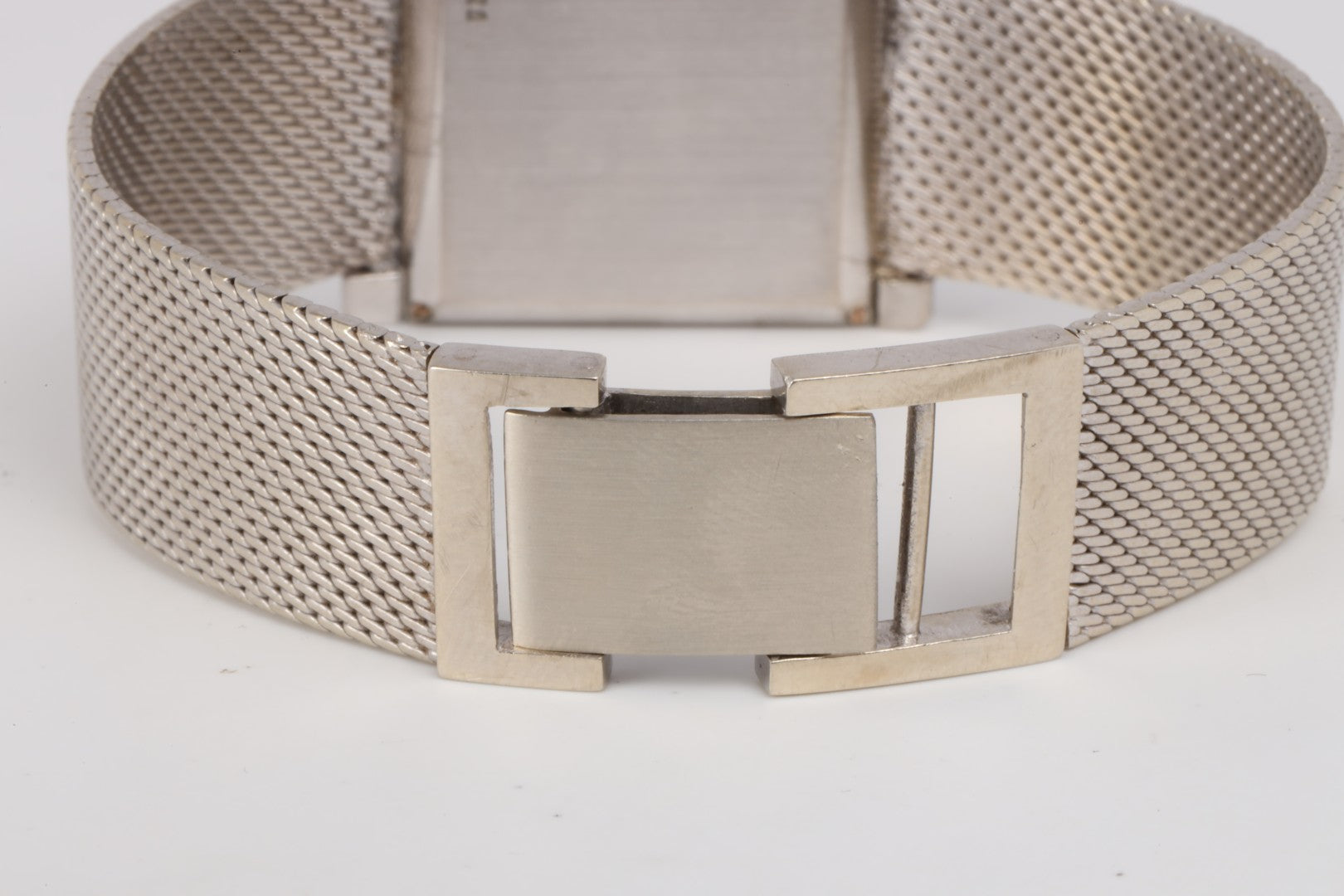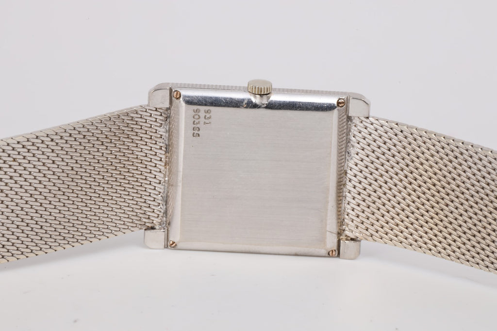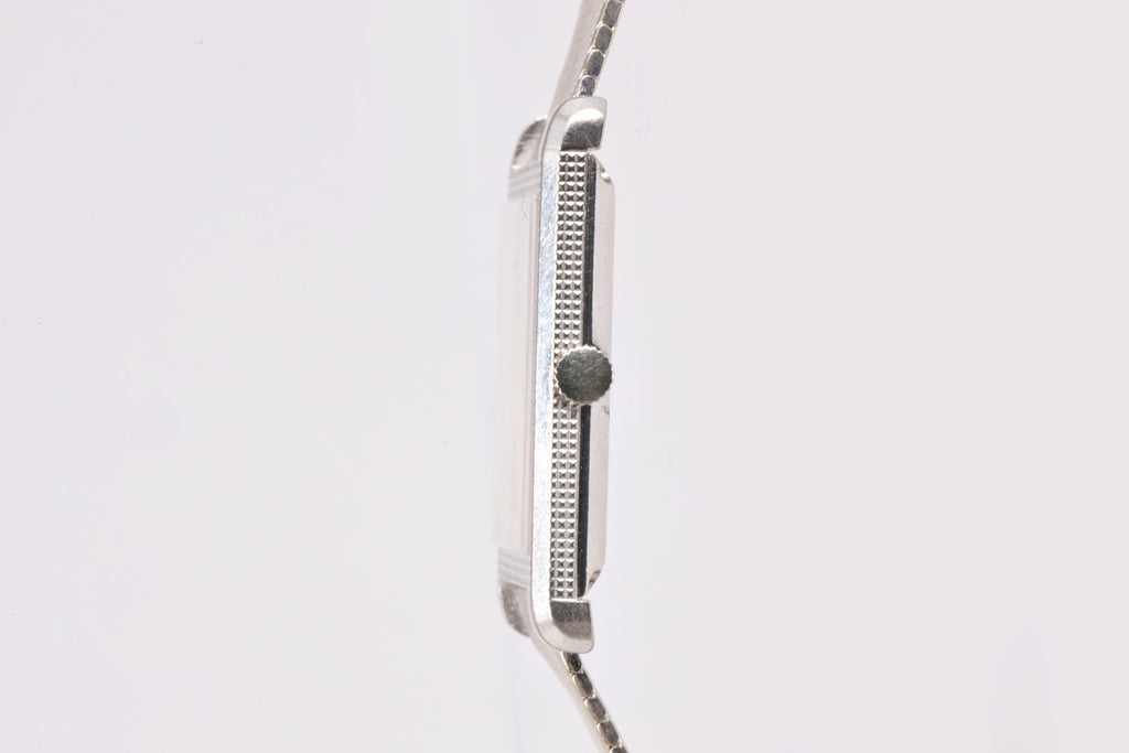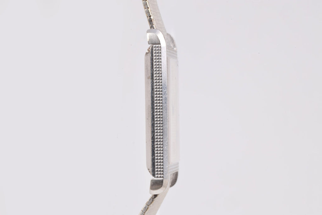 This elegant vintage Piaget Toblerone 931 features a 23mm x 29mm rectangular case in 18k white gold, powered by a manual wind Caliber 9P movement with a 36-hour power reserve. It is fitted with an aftermarket 14k white gold bracelet that accommodates up to a 6.5" wrist and secures with a flip clasp. The watch weighs 46.44 grams overall.