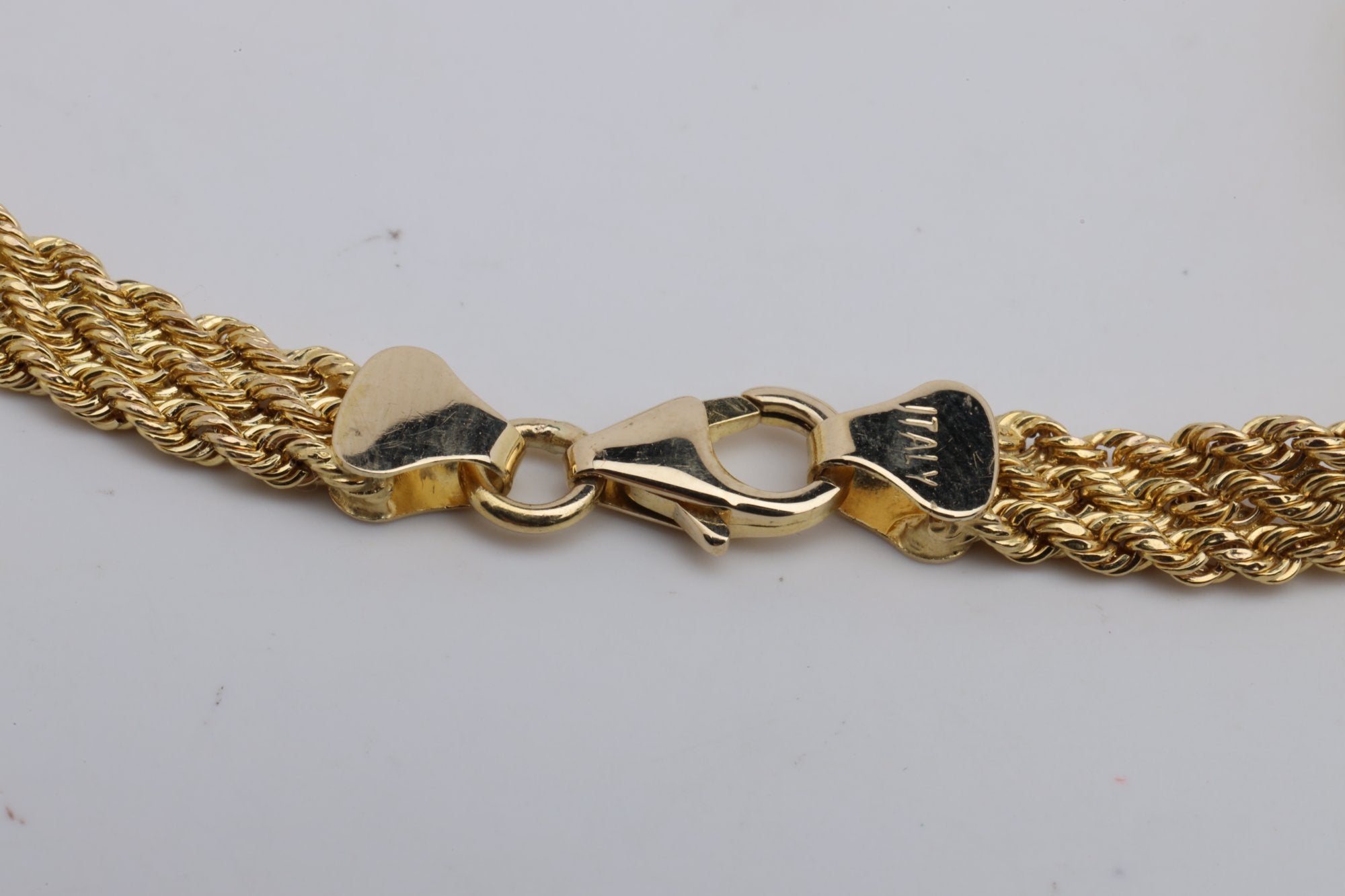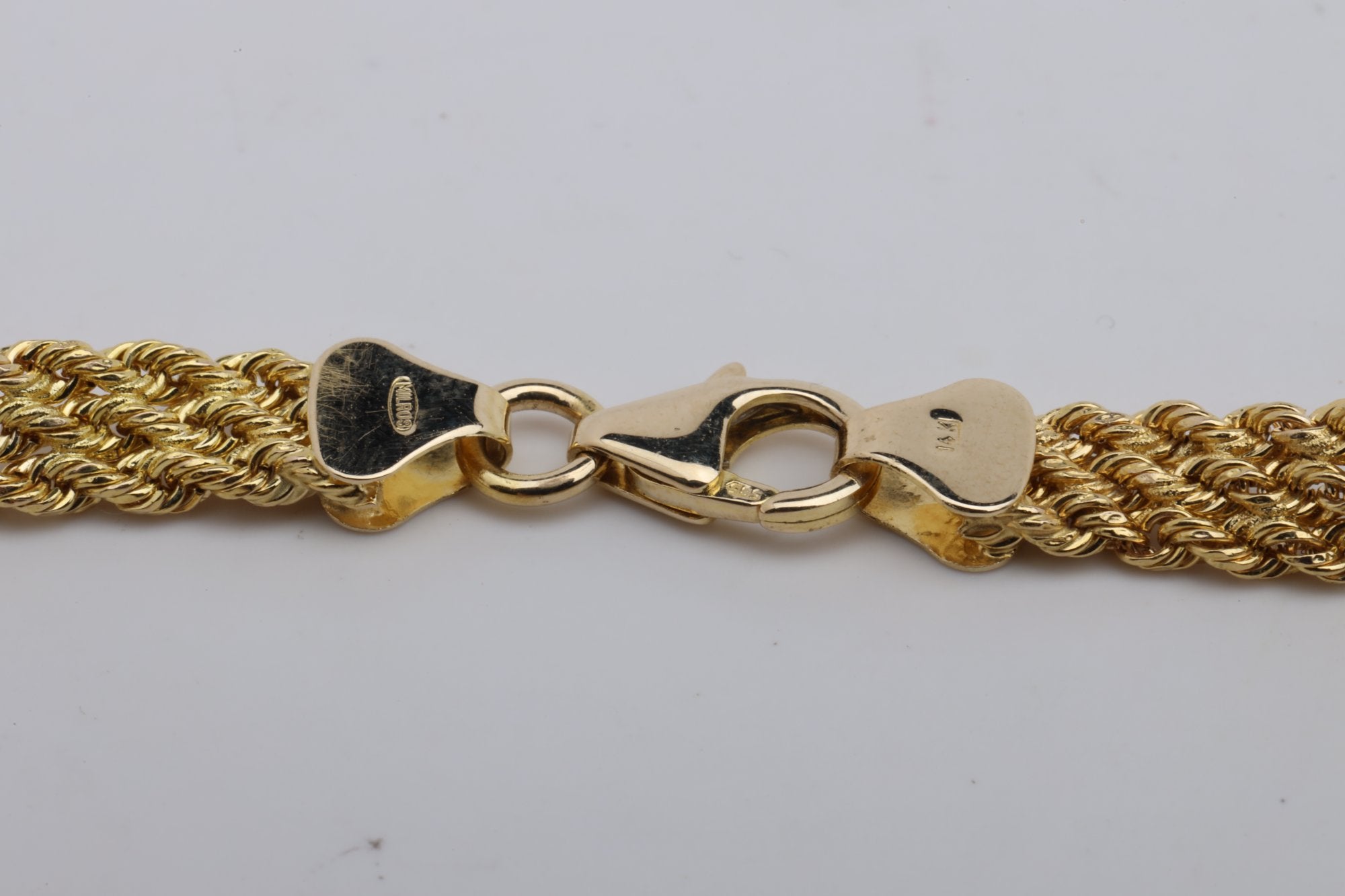 This exquisite piece is a 3 Strand Rope Chain XOX Bracelet, crafted from 14k Yellow Gold. The bracelet features a Lobster clasp and is marked with the stamp '14k'.