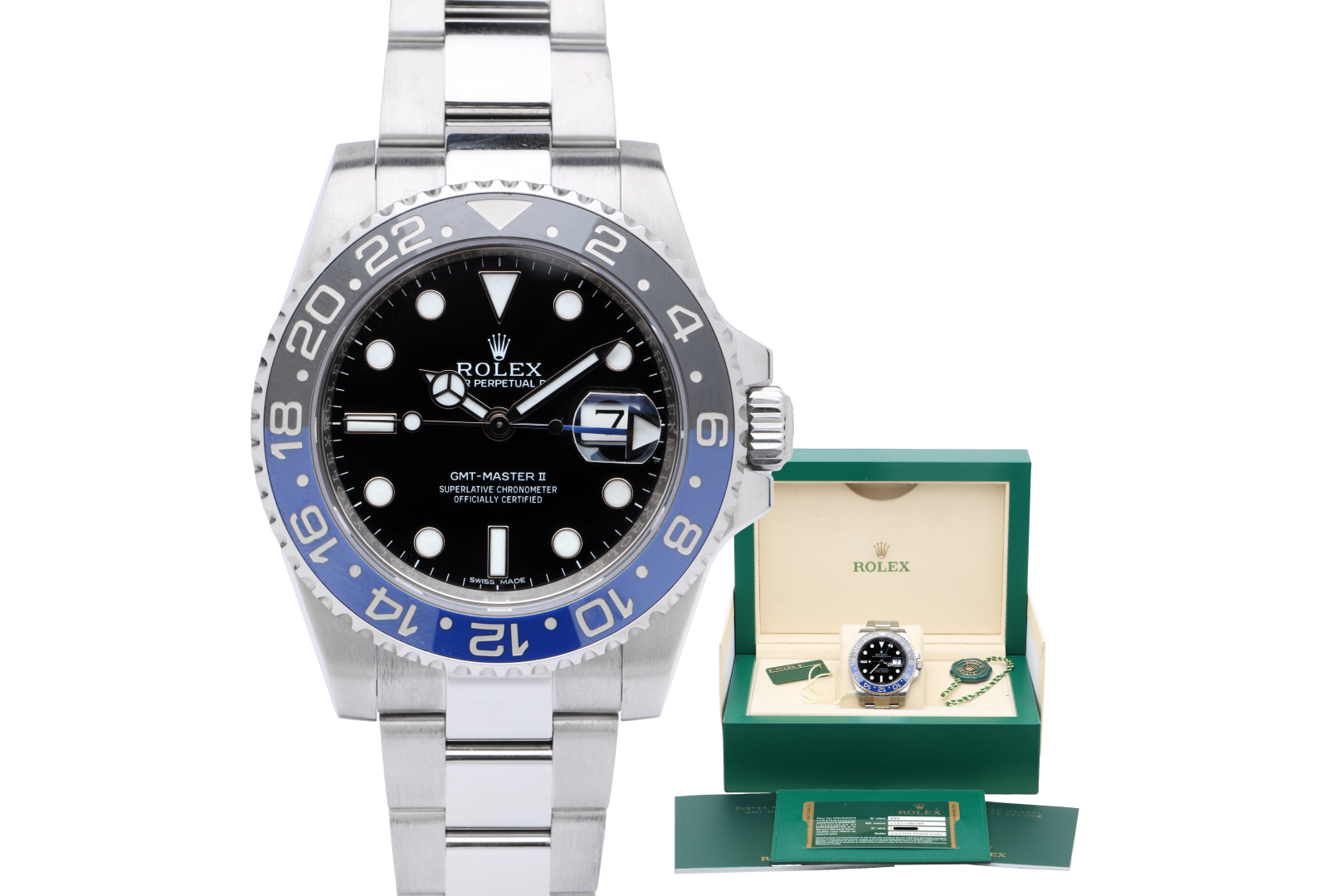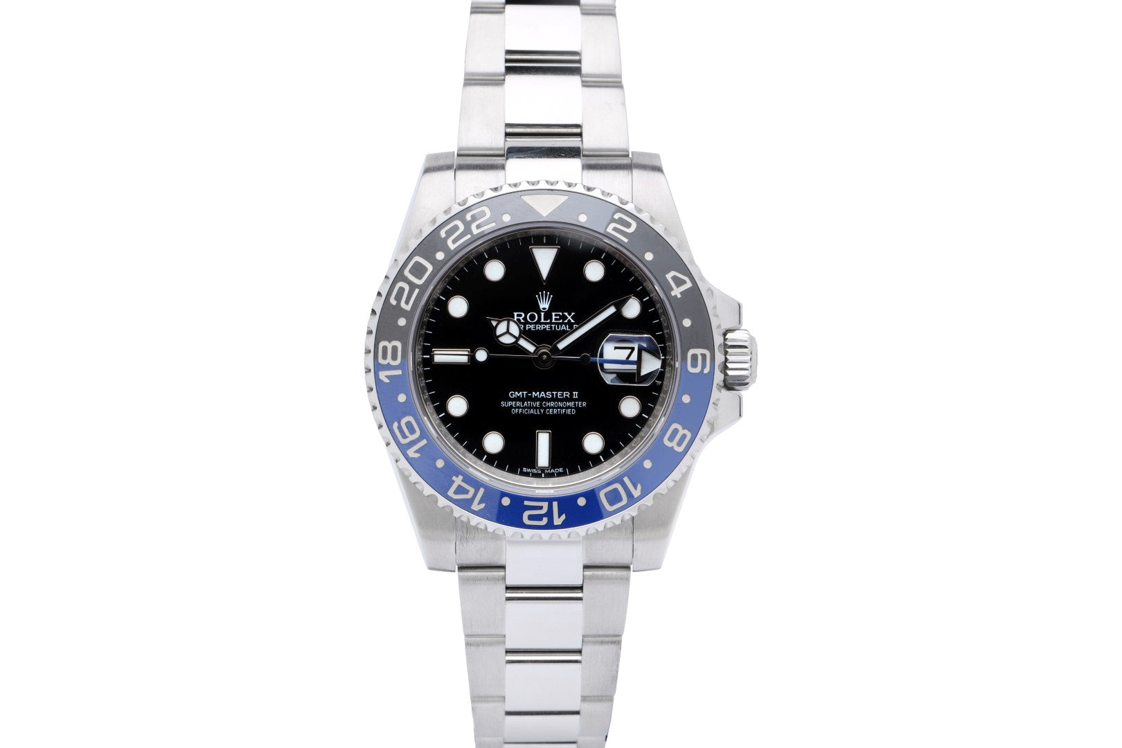 A highly sought-after Rolex GMT-Master II reference 116710BLNR, famously known as the "Batman" for its distinctive black and blue rotating bezel. Crafted in Switzerland in 2014, this 40mm stainless steel model features a robust Oyster case with sapphire crystal and a bidirectional rotating bezel. Designed for travel, it offers hours, minutes, seconds, and date functionality, powered by the automatic Rolex caliber 3135 movement with a 48-hour power reserve. Currently running at approximately +11 seconds per day, it has passed a pressure test up to 5 bar and maintains a 10 ATM water resistance rating. The Oyster bracelet fits up to a 6.75" wrist and includes 5 screws.