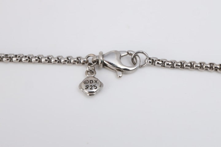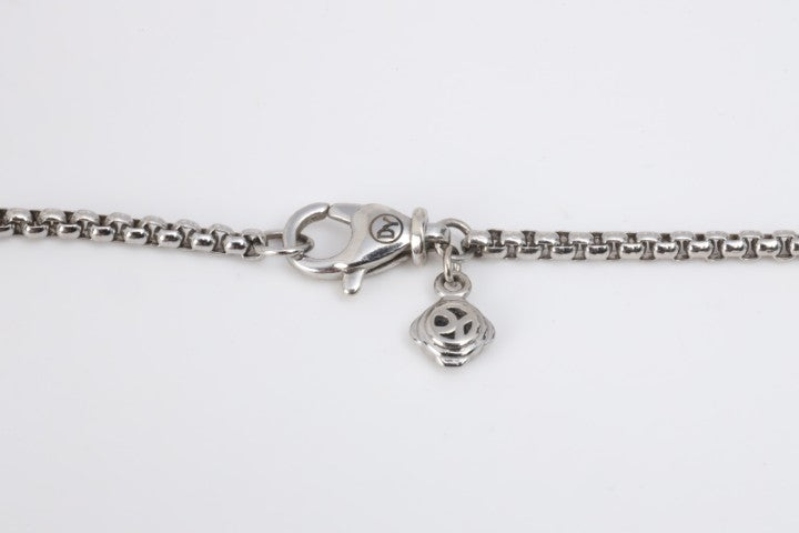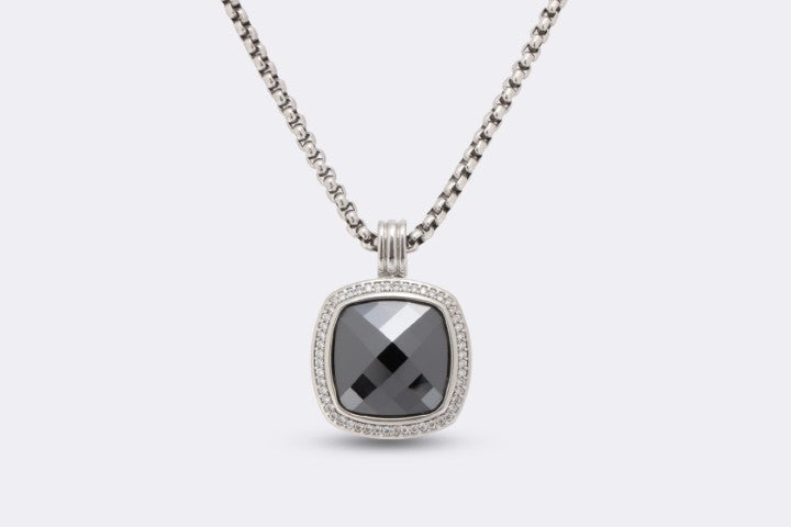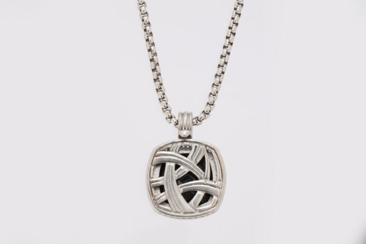 From David Yurman’s iconic Albion collection, this sterling silver necklace features a bold cushion-cut black onyx centerpiece weighing approximately 6.46 carats. Surrounded by 55 round brilliant diamonds totaling 0.28 carats (F/G color, VS1 clarity), the pendant hangs from a 20-inch box chain. Weighing 19.25 grams, this piece blends striking contrast with signature Yurman sophistication. Approximate retail: $1,675.