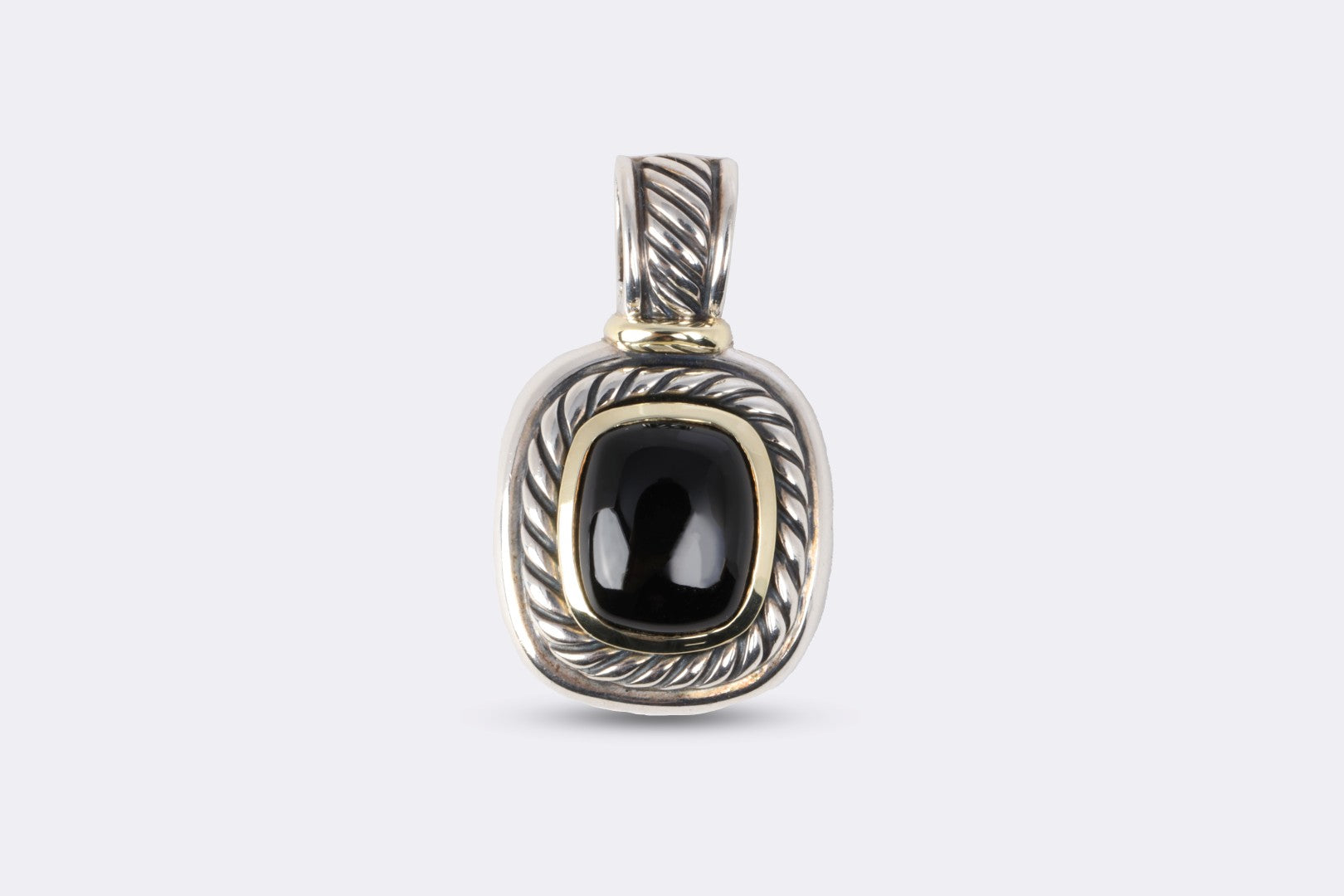 This David Yurman pendant showcases a bold 11.50mm cabochon cut black onyx (Approx. 1.50tcw) framed in sterling silver with 14k yellow gold accents. Weighing 10.62 grams, it features a charm enhancer clasp for easy attachment to your favorite chain. Approximate retail: $900.