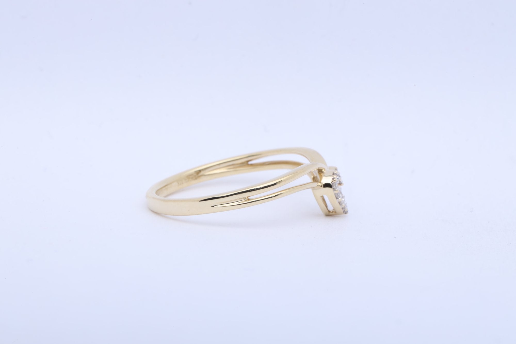 This beautiful ring, crafted from 10k yellow gold, features a delicate open heart design. The heart is adorned with 14 single cut diamonds, totaling 0.03ctw, adding a touch of sparkle to the piece. The diamonds are of K color and I1-SI1 clarity, offering a beautiful contrast against the yellow gold.