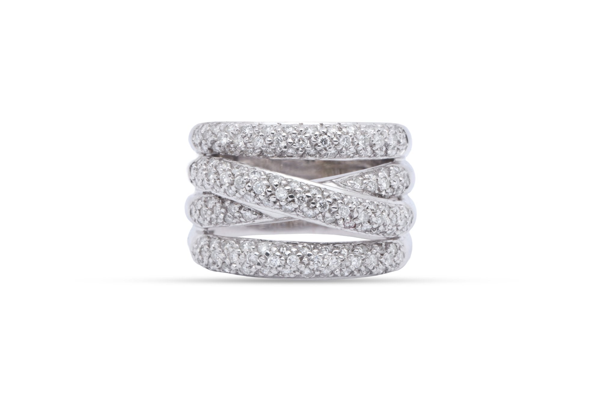 This exquisite ring, crafted from 18k white gold, features a stunning multi-row crossover design. The ring is adorned with 58 round brilliant diamonds, totaling 0.29ctw, that beautifully pave the rows, creating a dazzling display of sparkle and elegance.