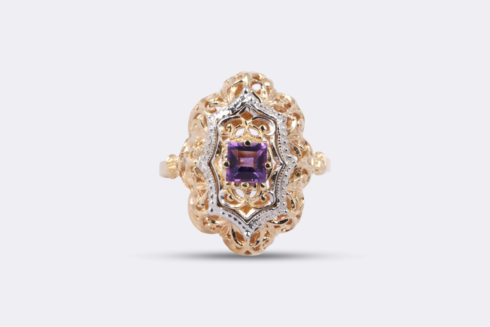 This vintage-inspired cocktail ring showcases a vibrant princess-cut amethyst (~0.40ct) set in a sleek two-tone 14k white and yellow gold design. A striking pop of purple with clean lines and elegant presence—perfect for adding color to any stack or standing alone as a statement. PM Number: PM2018655.