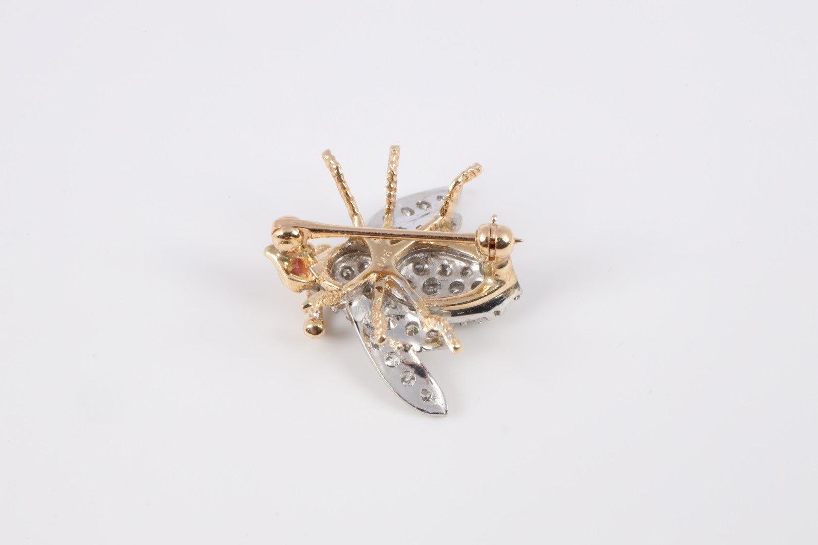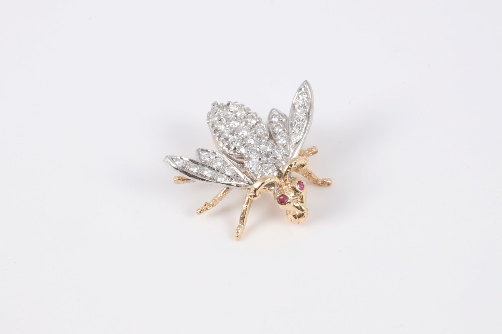 This charming vintage bee brooch is beautifully crafted in 14k two-tone gold, with white and yellow gold detailing that enhances its dimensional design. Sparkling with approximately 0.68 carats of round brilliant diamonds and accented by two pink-red rubies as the eyes, this piece captures timeless craftsmanship and character. PM Number: PM4009375.