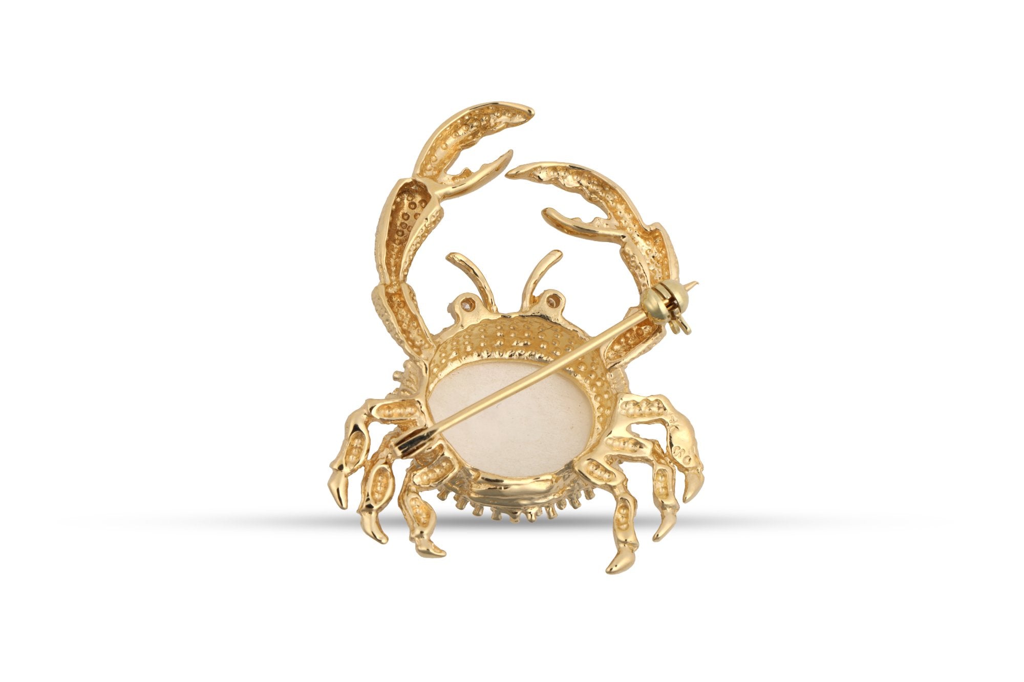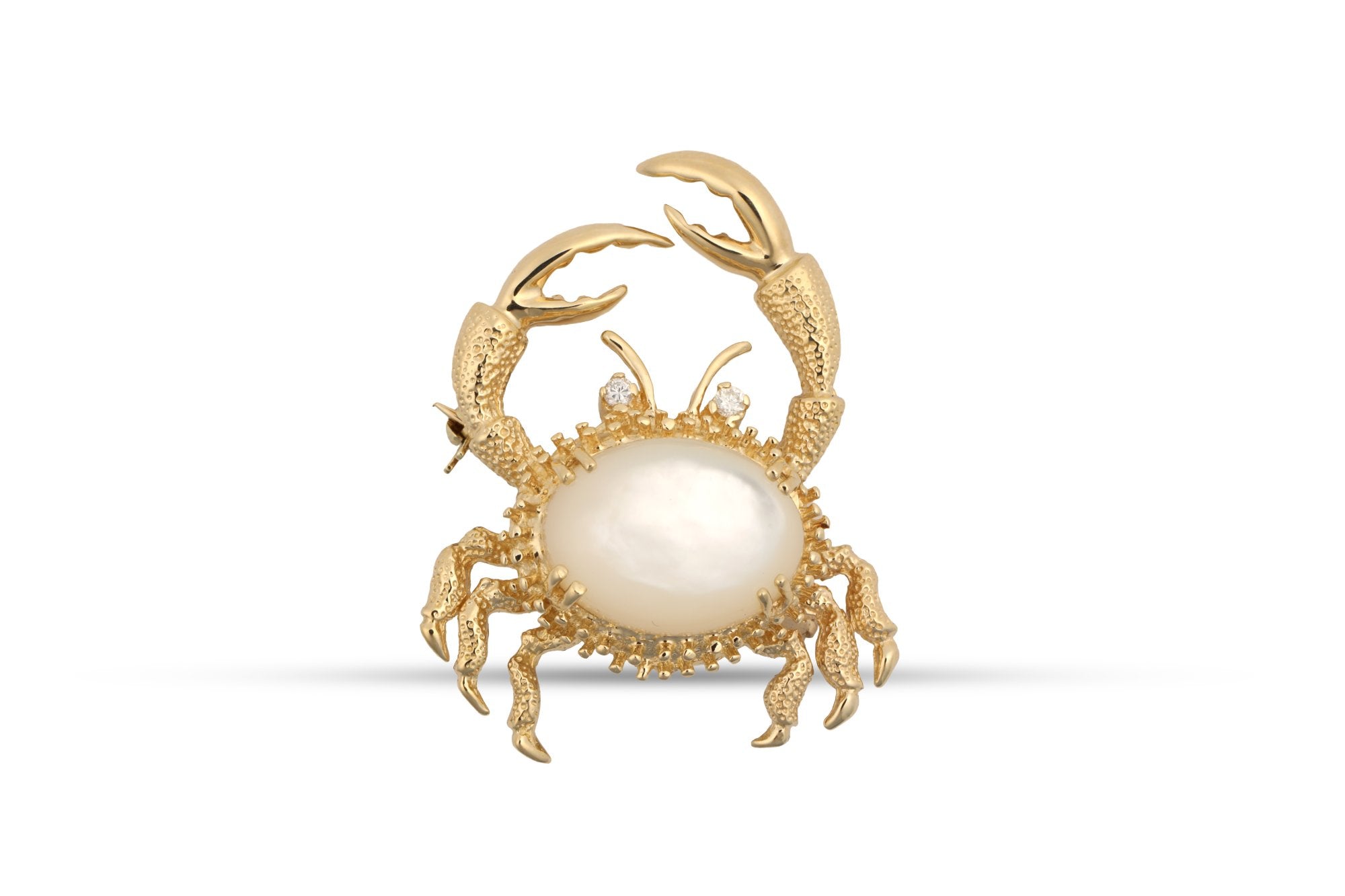 This unique piece is a textured crab brooch, crafted from 14k yellow gold. It features a round brilliant diamond and a near white cabochon pearl, adding a touch of elegance to the design.
