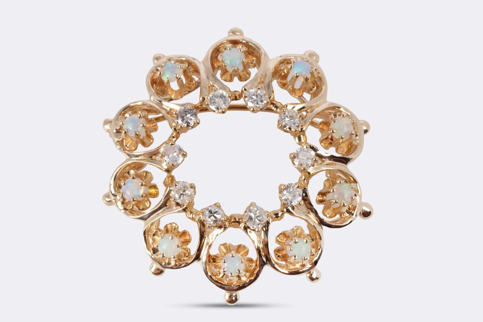 This elegant vintage-inspired brooch doubles as a pendant, crafted in rich 14k yellow gold and set with sparkling round brilliant diamonds totaling approximately 0.60 carats. Accented by ten iridescent round cabochon opals totaling around 0.40 carats, this piece glows with soft color play and timeless charm. Its versatile pin and hook clasp allows it to be worn as either a brooch or pendant, making it a perfect statement for any occasion. PM Number: PM2018007.
