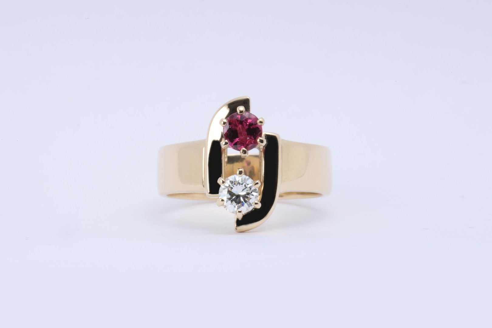 This vibrant 14k yellow gold ring features a stunning combination of a 0.30 carat round brilliant diamond and an approximately 0.50 carat lab-grown ruby, all set in a solid 6.49g gold band. The ruby displays a deep raspberry hue that perfectly complements the sparkle of the high-clarity VS1 diamond. With a band measuring 8.35mm in width and 6.10mm in height, this ring offers bold presence while maintaining classic elegance.