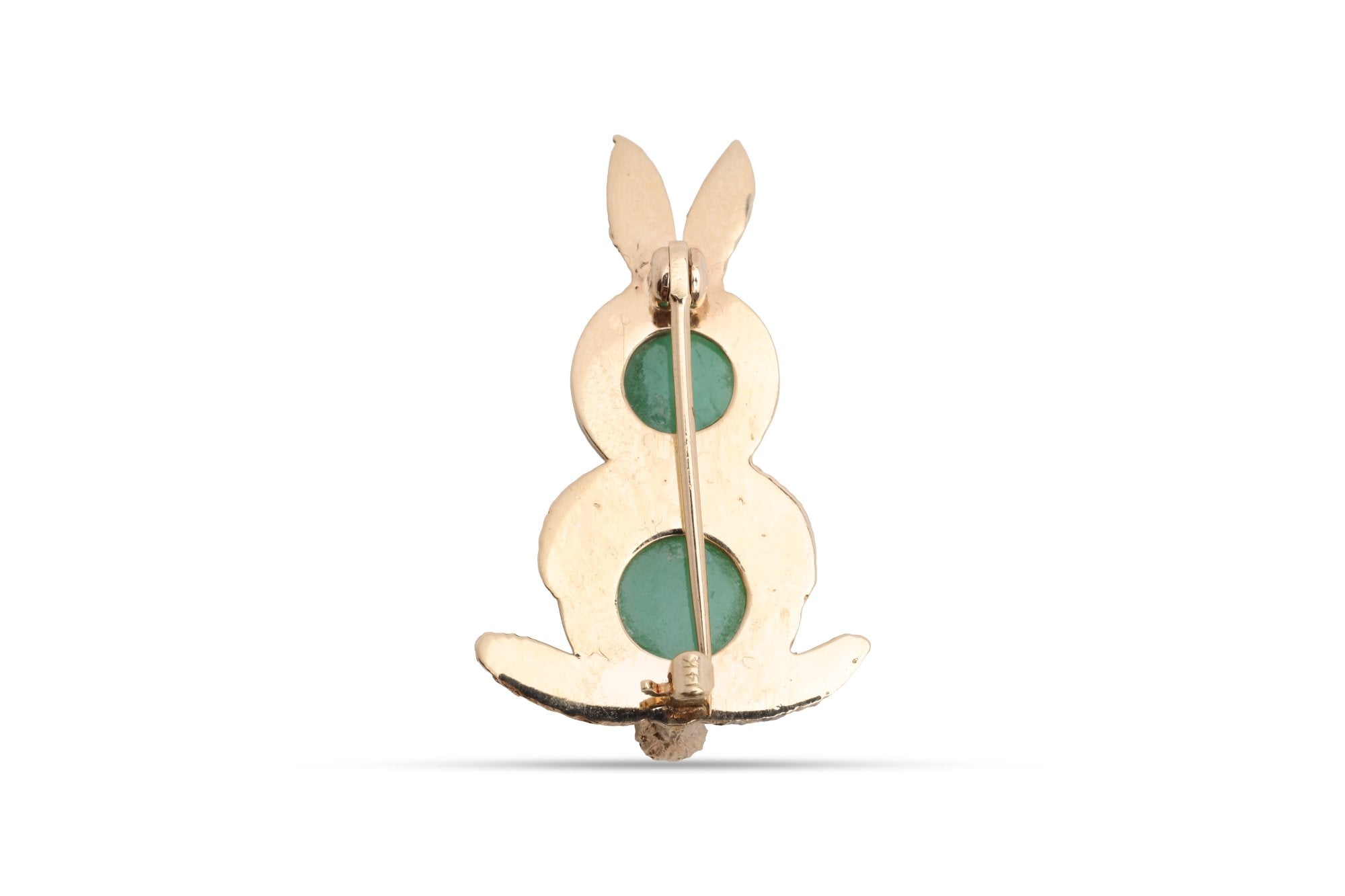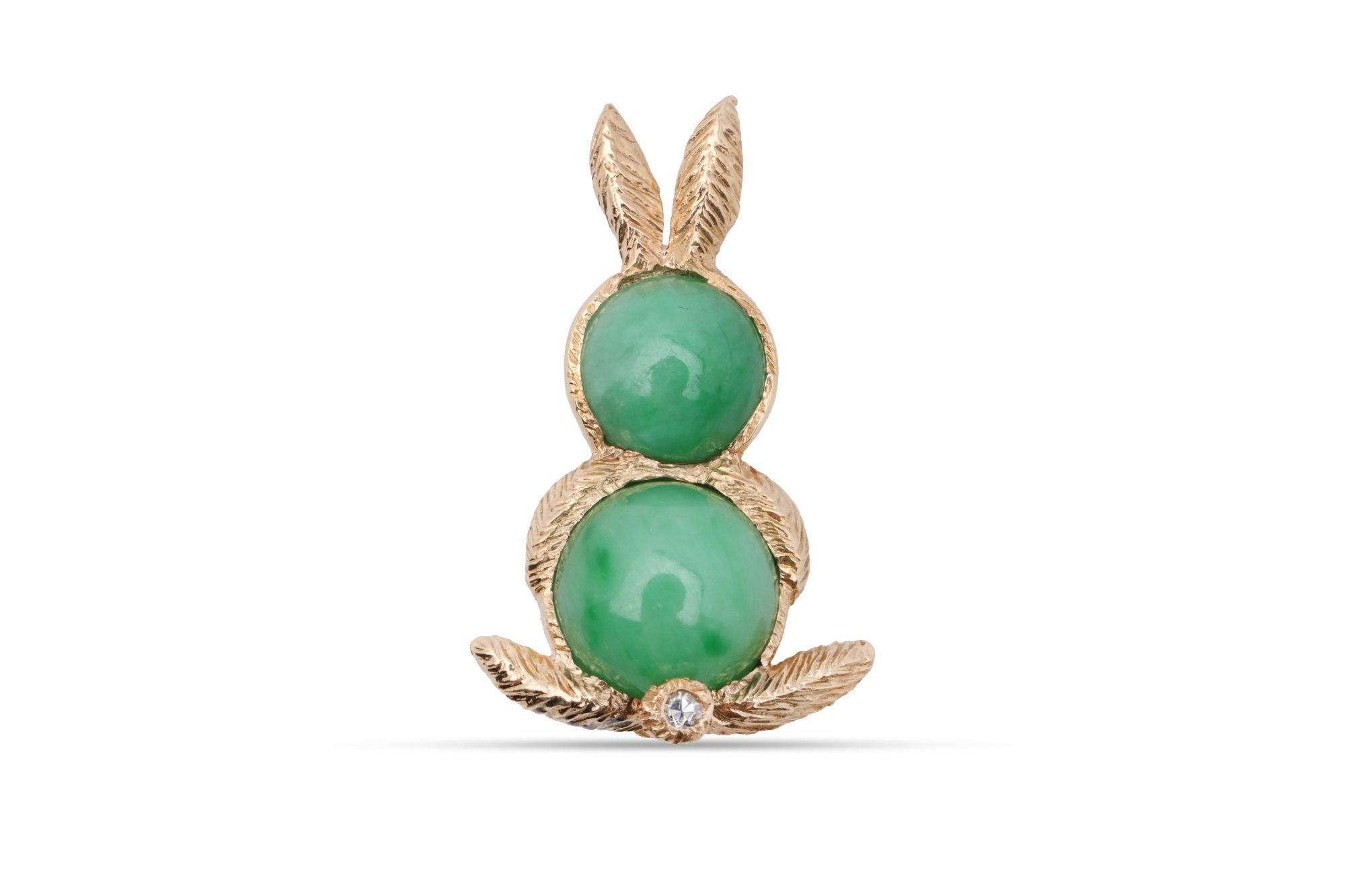 This charming brooch, crafted from 14k yellow gold, features a playful bunny design. The bunny is adorned with two stunning 12.98ctw cabochon cut jade gemstones and a single round brilliant cut diamond weighing 0.03ctw. The diamond is of J color and I1 clarity, adding a subtle sparkle to the piece.