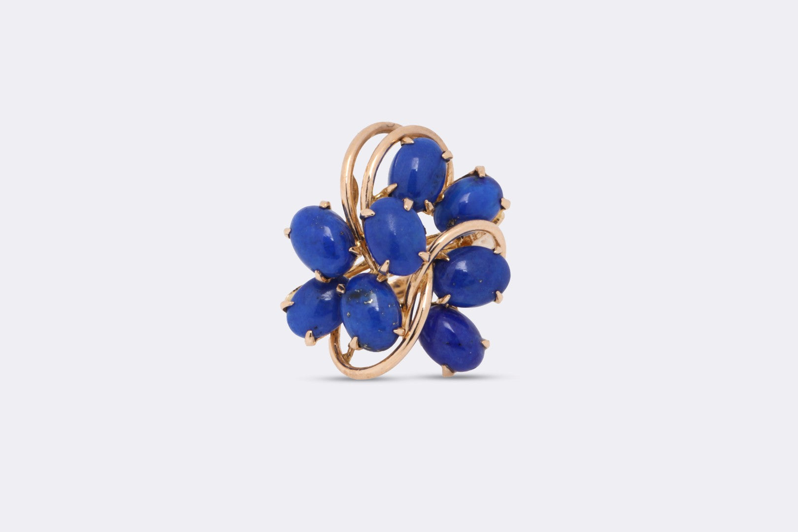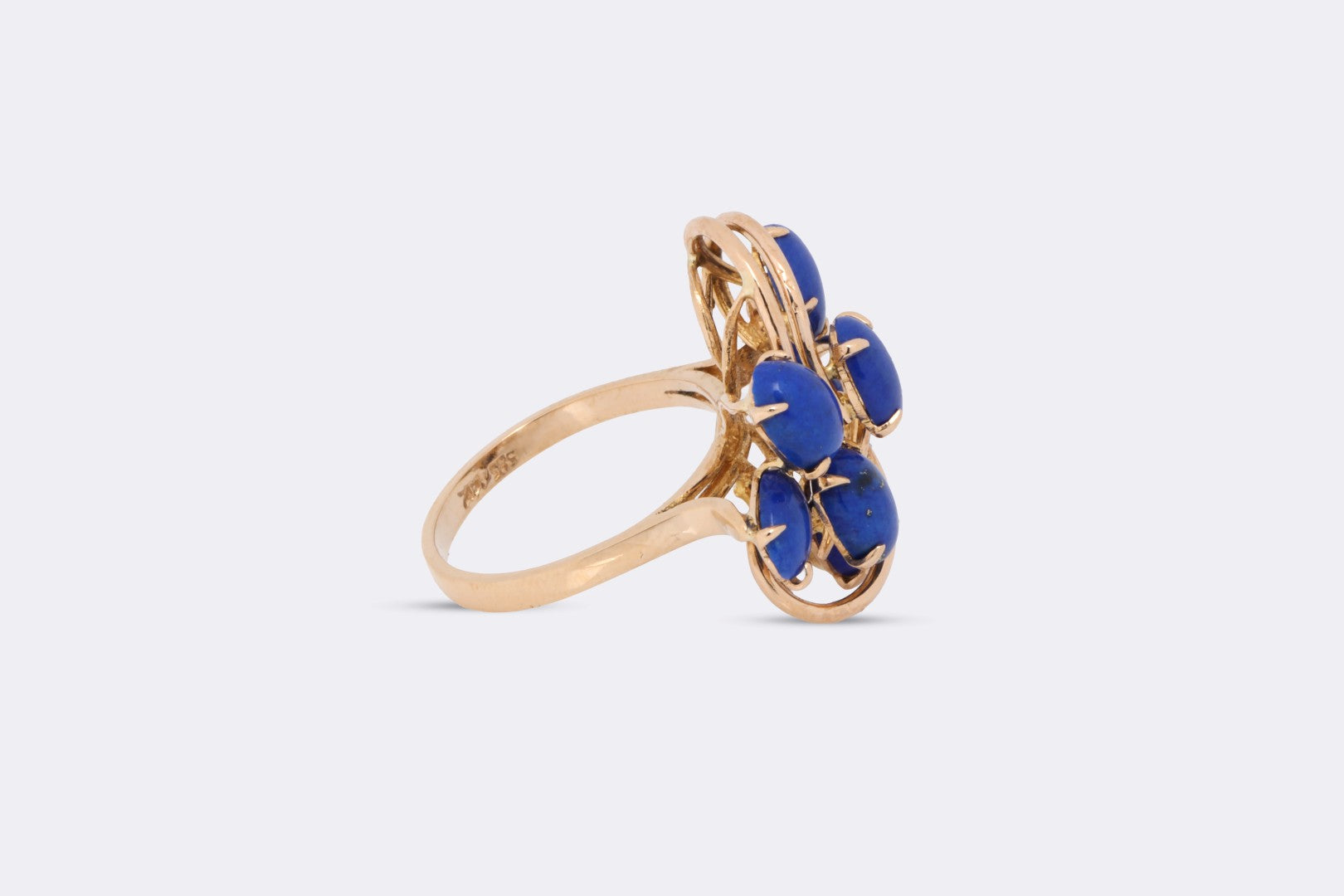 This bold cluster cocktail ring is crafted in 14k yellow gold and weighs 5.39 grams. Professionally authenticated and stamped “585 14k,” it features eight cabochon-cut dyed blue lapis lazuli stones totaling approximately 4.60 carats. Maker’s marks are present on the inner band. Originally retailing for $1,000, this vibrant vintage piece adds striking color and unique design to any fine jewelry collection.