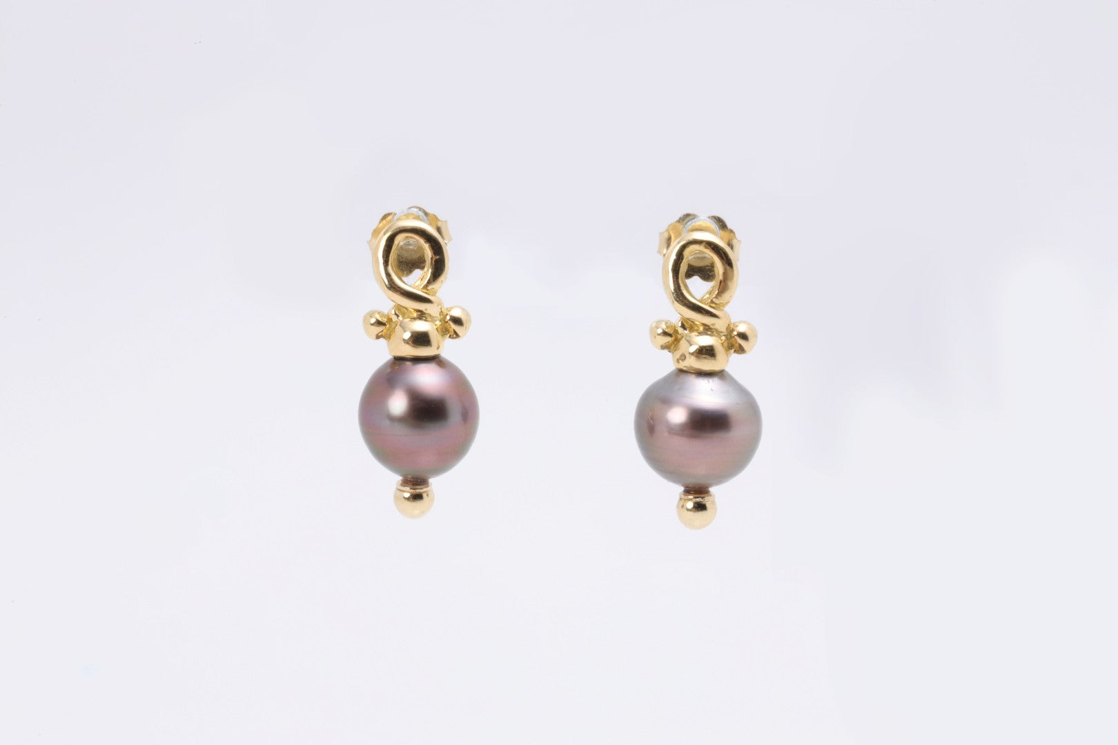 These elegant drop earrings showcase a pair of lustrous peacock grey Tahitian pearls suspended from polished 18k yellow gold settings. Featuring off-round pearls and secure push back closures, this timeless pair adds a refined touch of luxury to any look. Stamped 18k and marked by the maker. Approximate retail: $1,500.