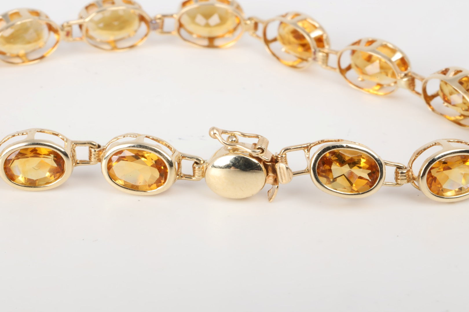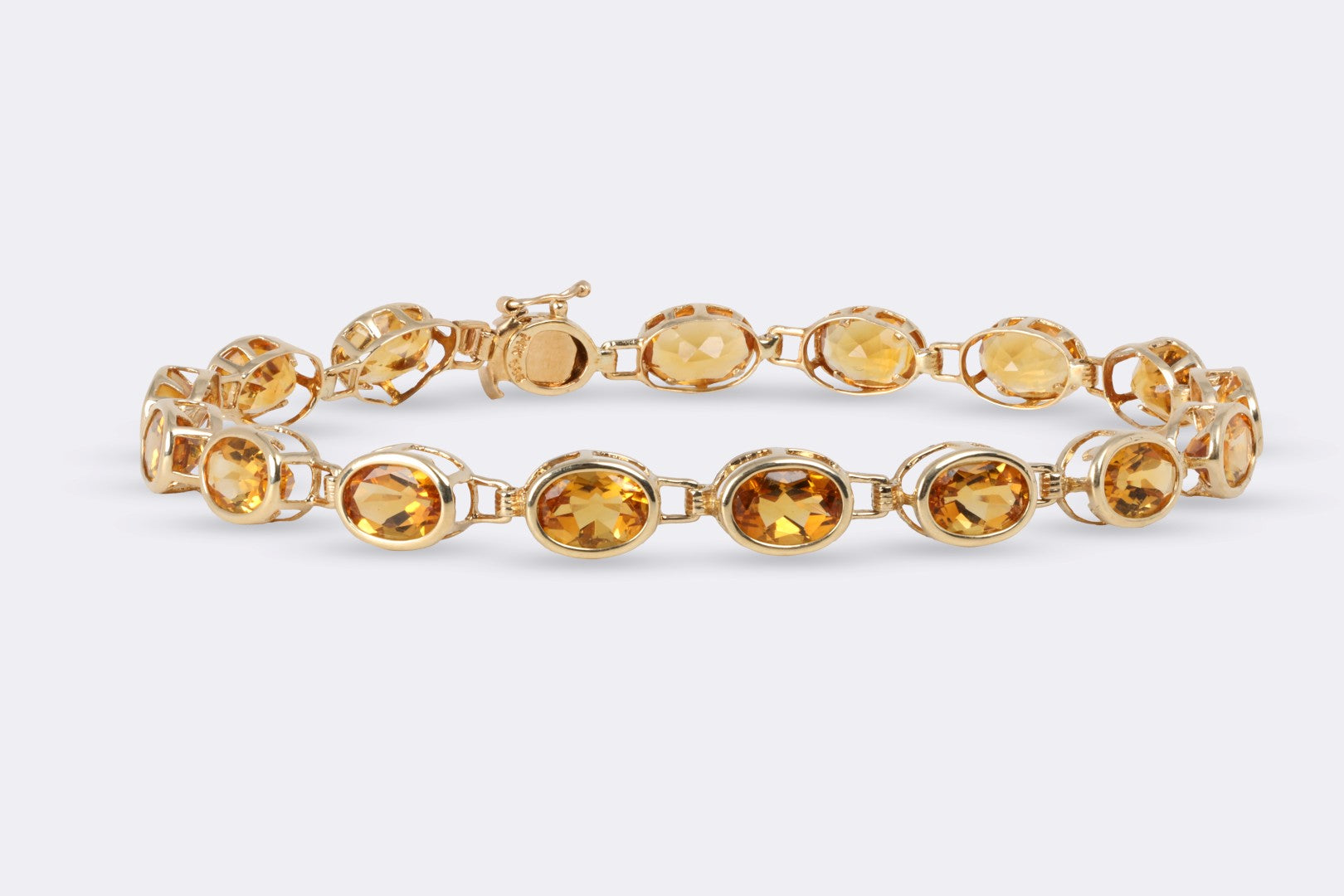 This vibrant tennis bracelet showcases 16 oval-cut citrine gemstones set in rich 14k yellow gold. With approximately 10.55 total carats of warm yellow-orange brilliance, it's a perfect balance of elegance and everyday wearability. The secure bracelet catch keeps it comfortably in place, making it an ideal piece for both stacking and solo statement styling.