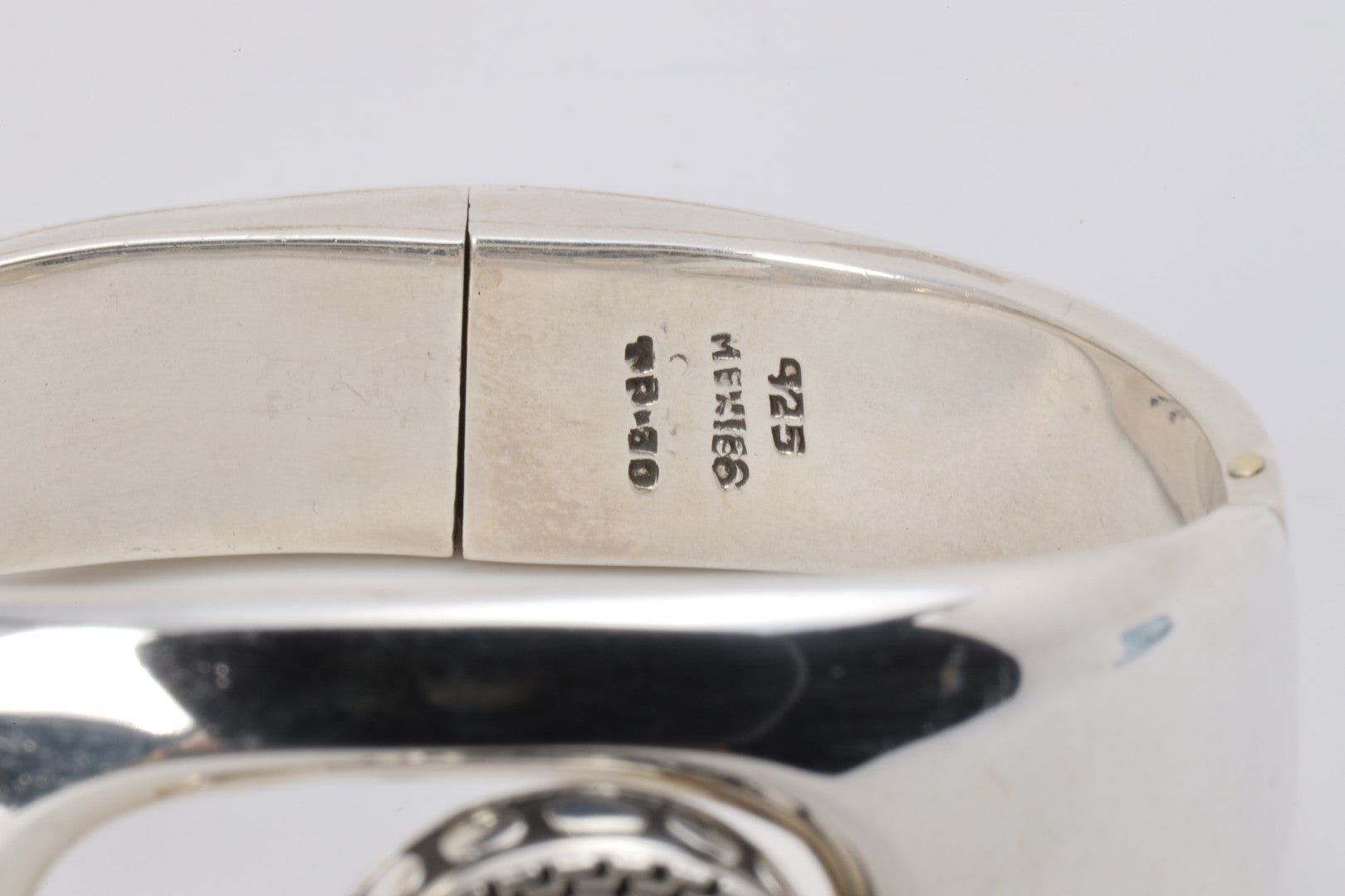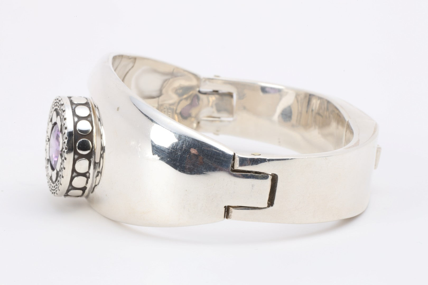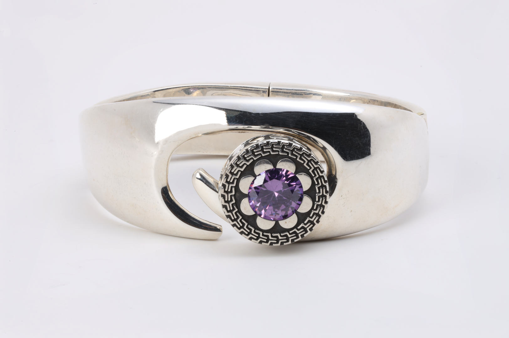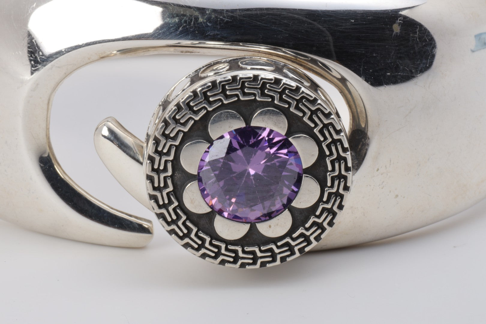 7" 925 Silver Purple Stone Flower Design Hinged Bangle Bracelet (57.53g.)