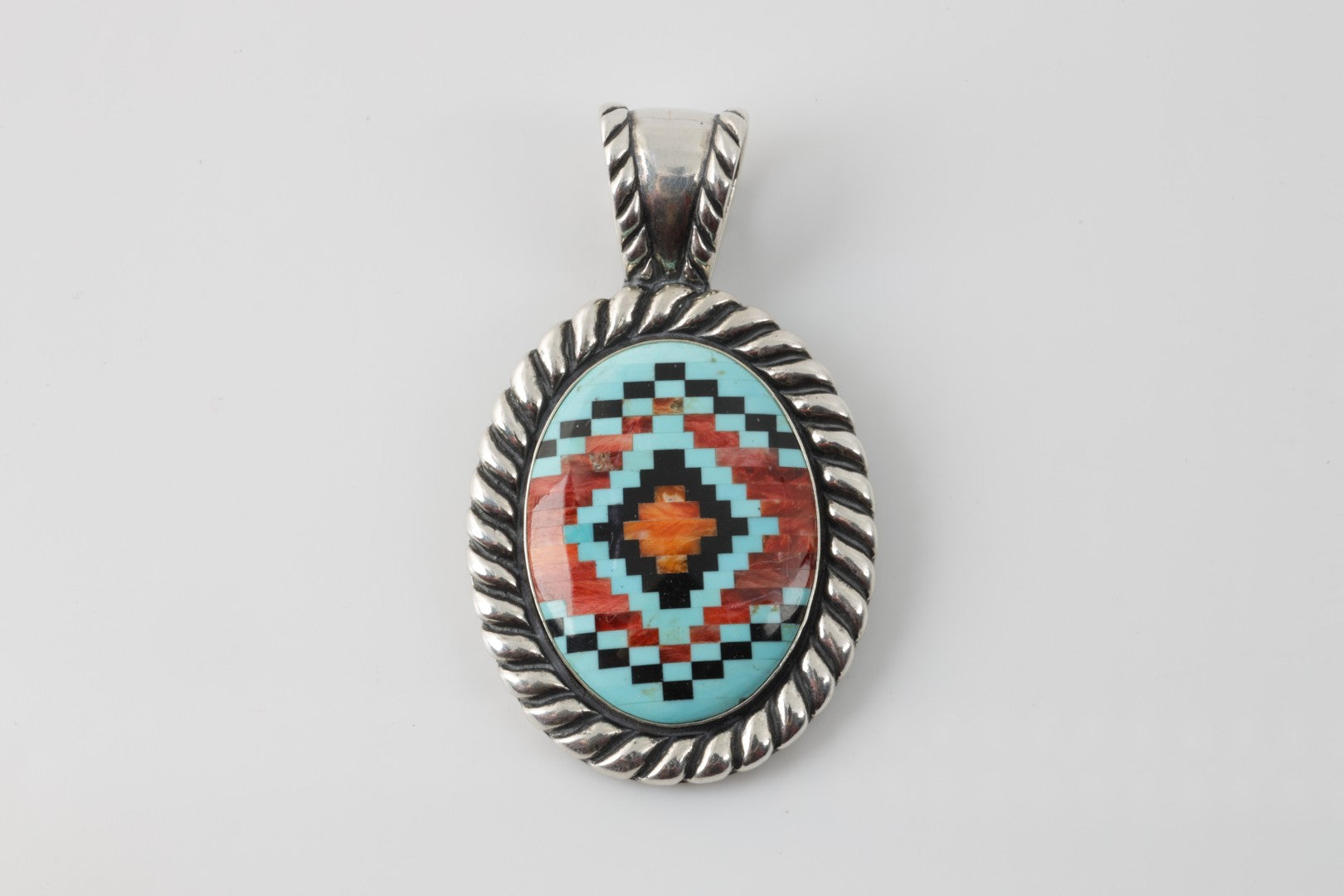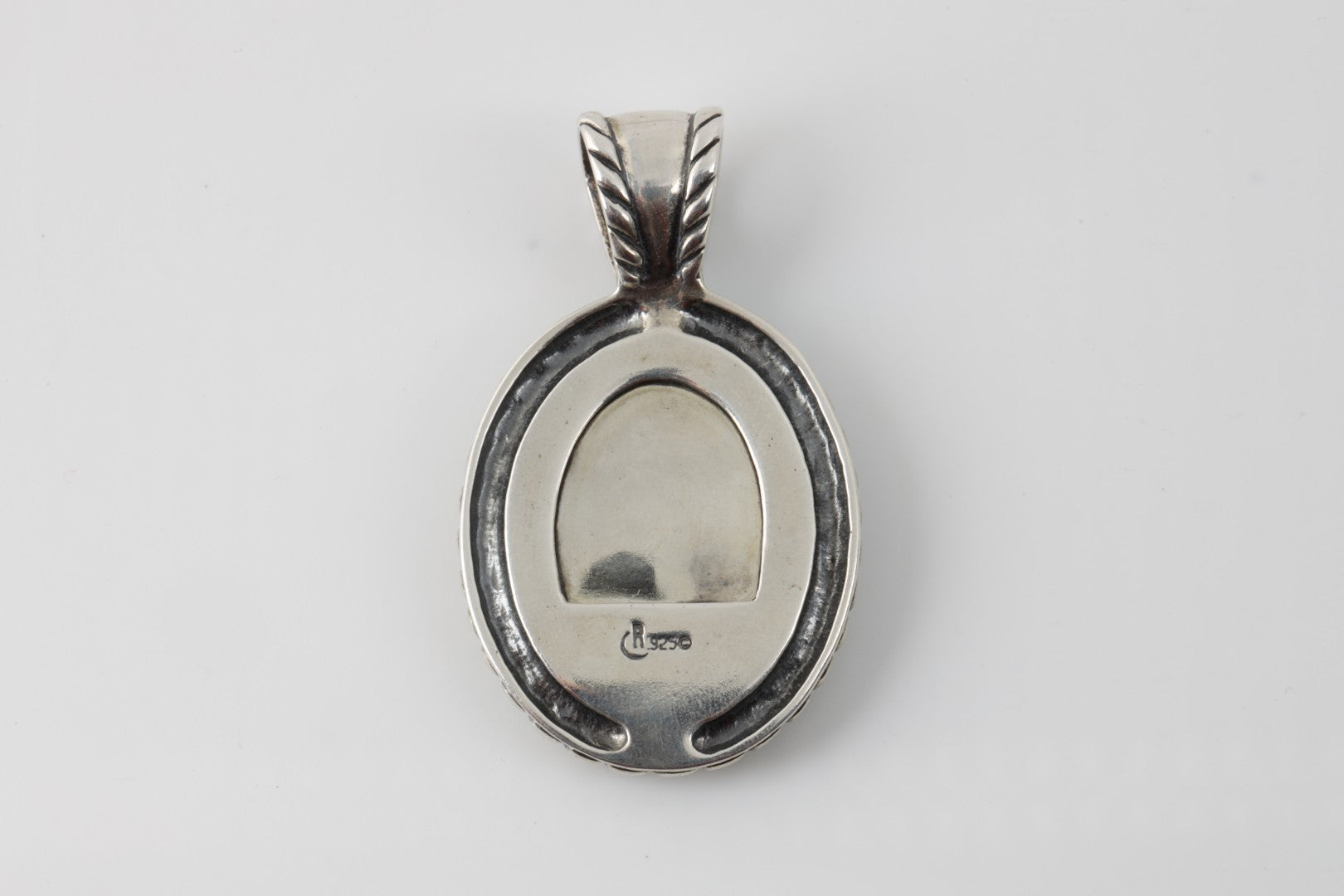 This Carolyn Pollack mosaic pendant is crafted in 925 sterling silver and weighs 24.59 grams. Professionally authenticated and stamped “925” with maker’s marks, the piece showcases a bold inlay of carnelian, onyx, and turquoise stones. Originally retailing for $160, this artistic pendant reflects Pollack’s signature blend of vibrant gemstones and sculptural silverwork.