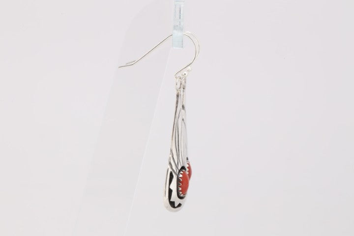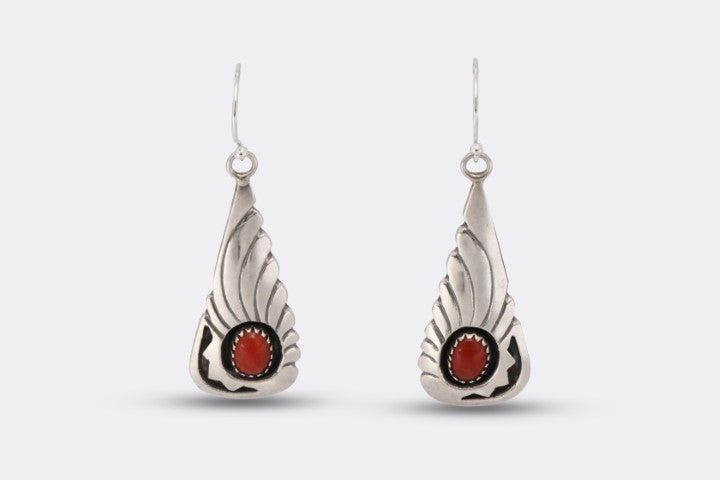 These handcrafted Native American earrings by John White feature bold red coral cabochons set in sterling silver. The elegant fish hook design and elongated silhouette offer a striking yet wearable style. Weighing 5.94 grams, they embody traditional craftsmanship with rich cultural significance. Approximate retail: $140.