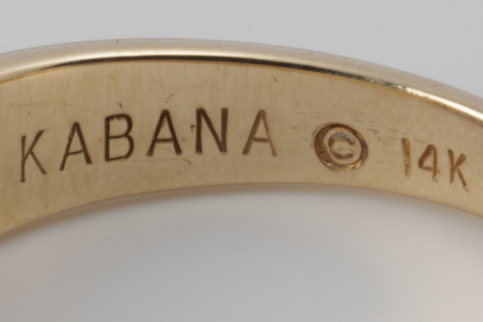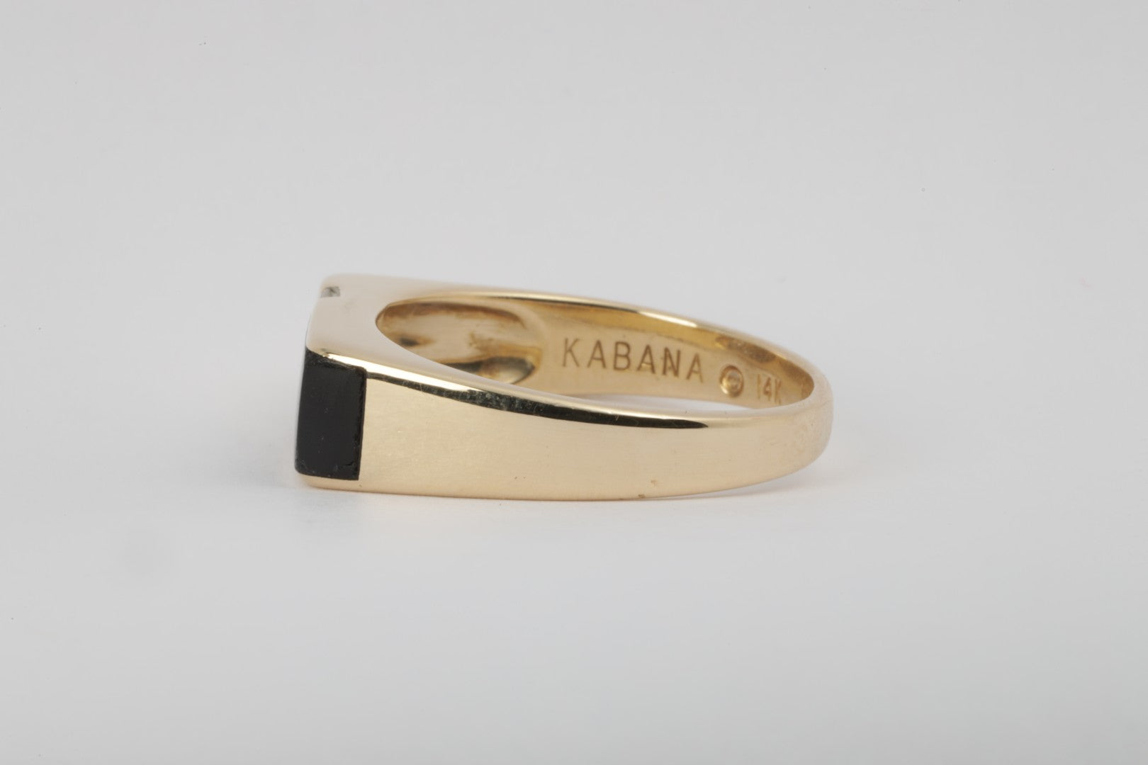 This striking Kabana ring is crafted in 14k yellow gold and showcases a sleek inlay of black onyx accented by three round brilliant diamonds totaling approximately 0.18 carats. The ring measures 7mm wide and 3.5mm thick, and is stamped “14k” and engraved with “KABANA.” This piece is an excellent choice for lovers of bold yet refined jewelry design. Approximate retail: $3,850.