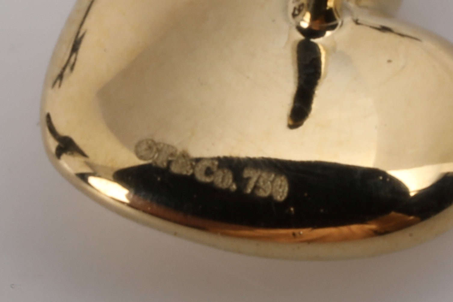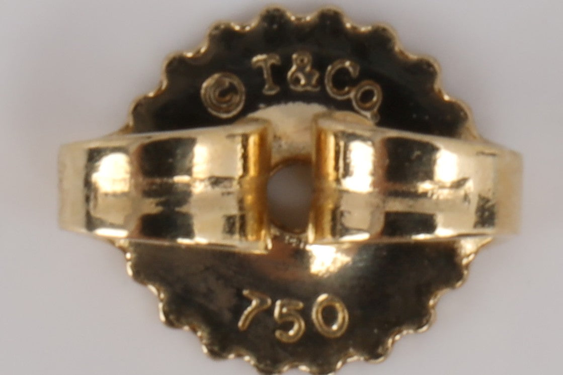 These Elsa Peretti heart stud earrings by Tiffany & Co. are crafted in 18k yellow gold and weigh 4.57 grams. Professionally authenticated and engraved with “T&Co.” and “750,” they feature six round brilliant diamonds totaling approximately 0.15 carats. Originally retailing for $2,400, these classic studs secure with pushbacks and showcase the timeless elegance of Peretti’s iconic design.