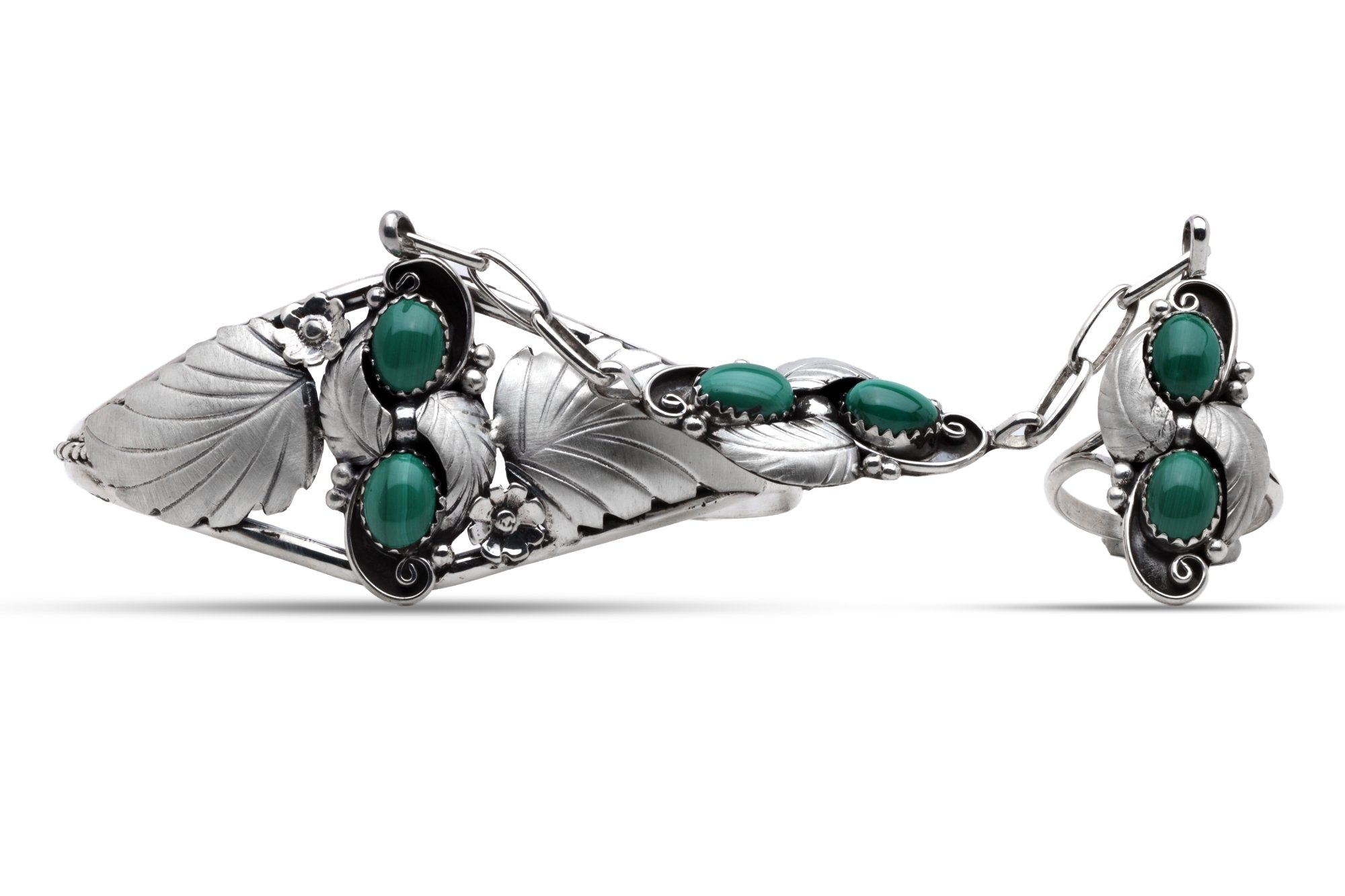 This unique piece is a combination of a ring and a cuff bracelet, connected by a hand chain. Crafted from sterling silver, it features six oval-cut malachite gemstones, known for their vibrant green color.