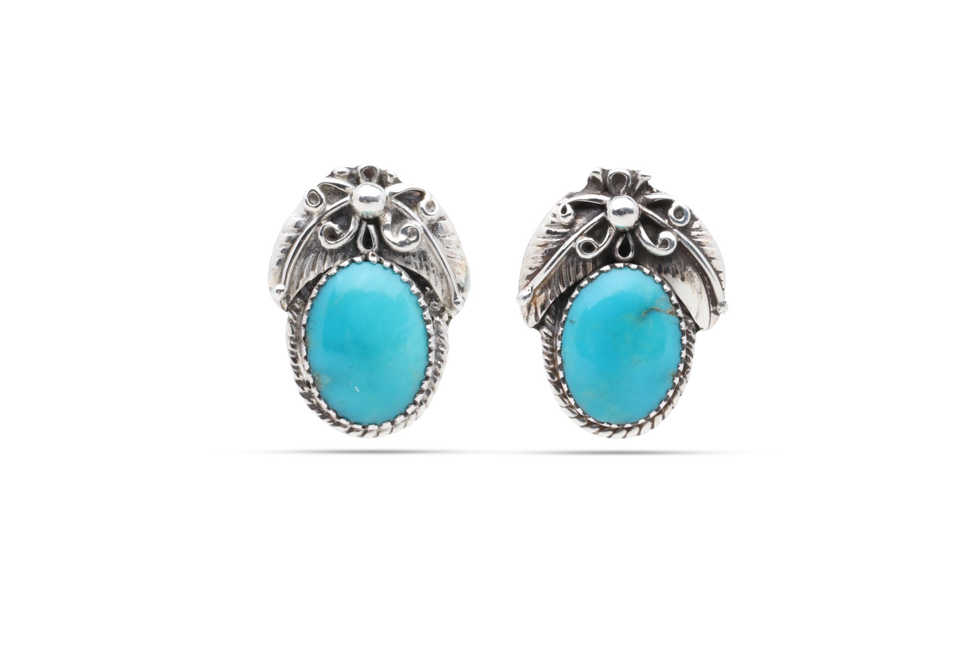 925 Silver Turquoise Cabochon Navajo Native Leaf Post Earrings (6.30g.)