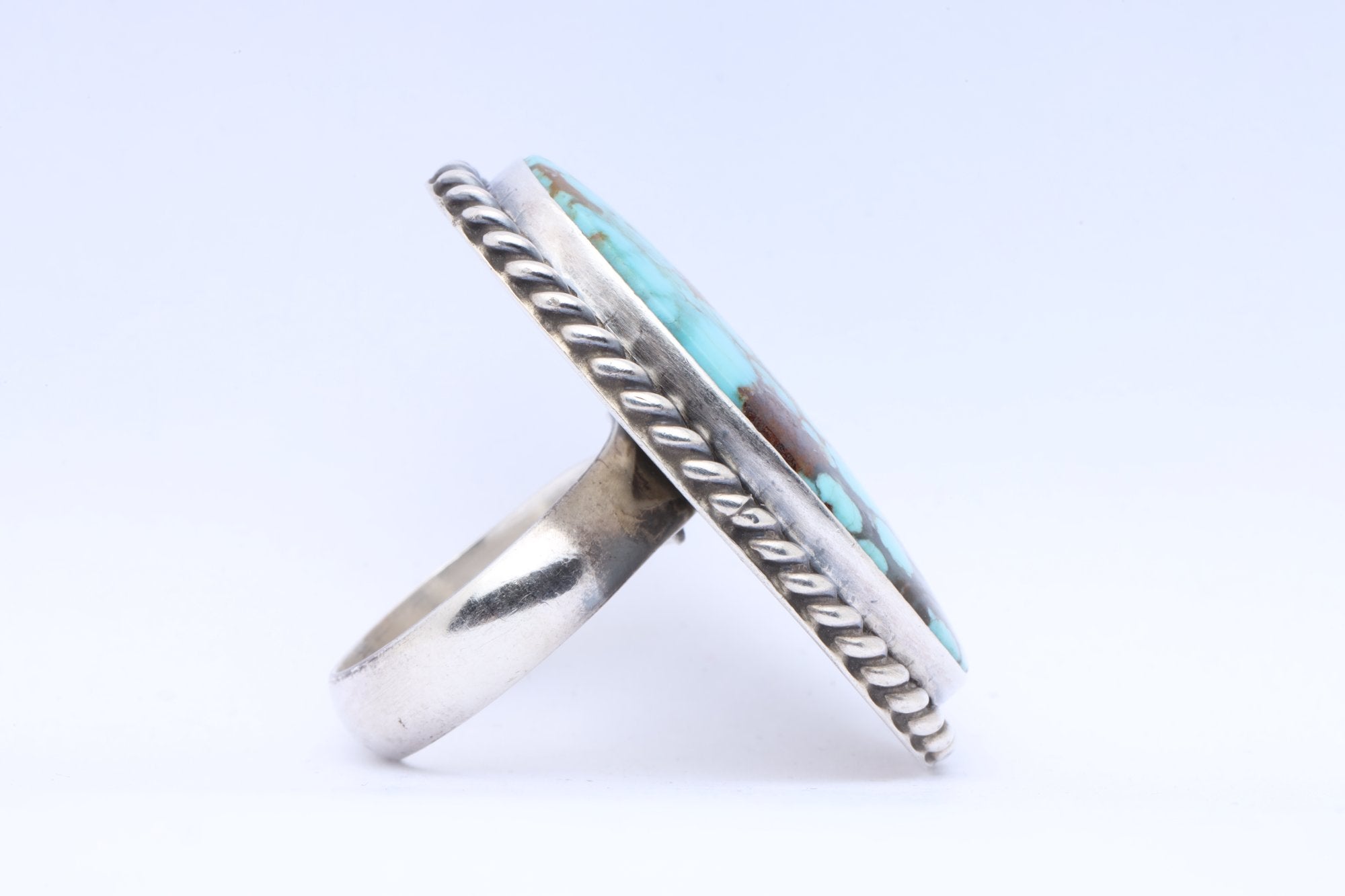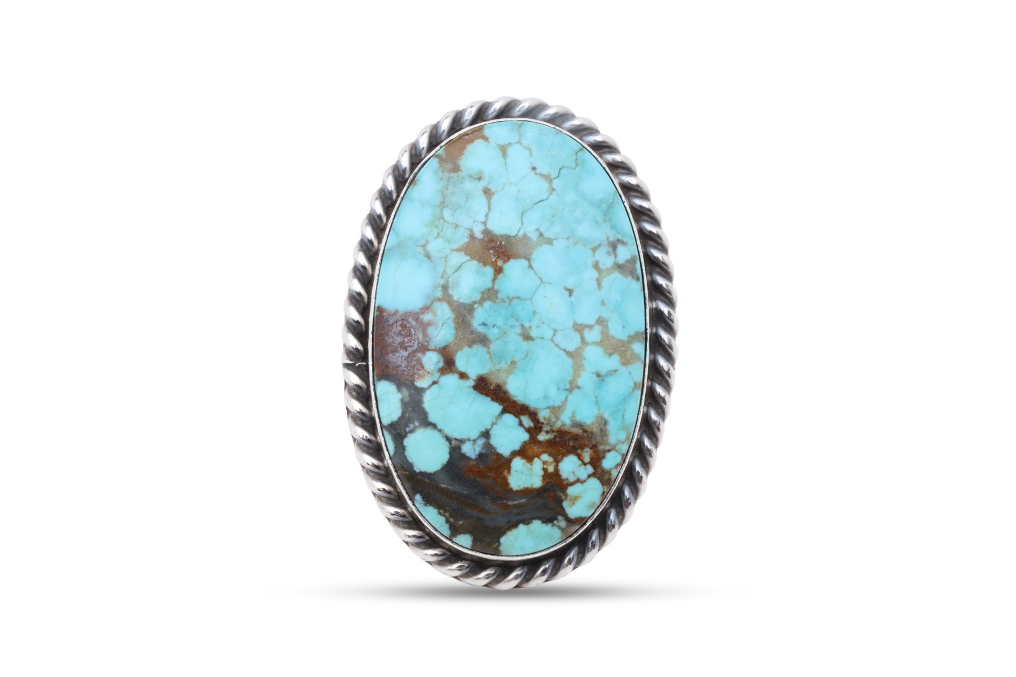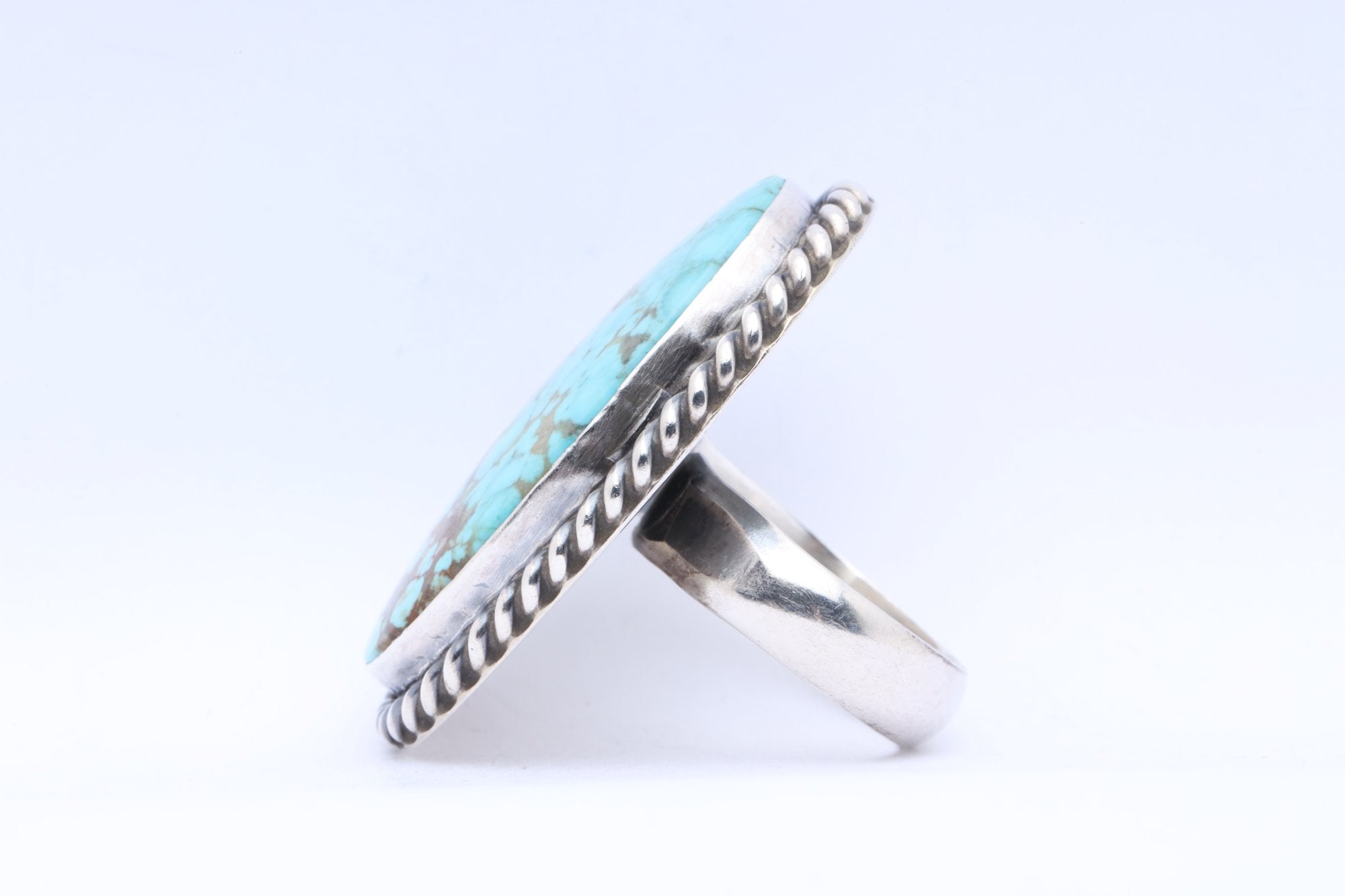 This exquisite piece by Alfred Martinez is a testament to the timeless allure of turquoise. The sterling silver ring features a single oval turquoise gemstone, weighing a total of 9.97ctw. The gemstone is beautifully set in a sterling silver setting, showcasing the craftsmanship of the designer.