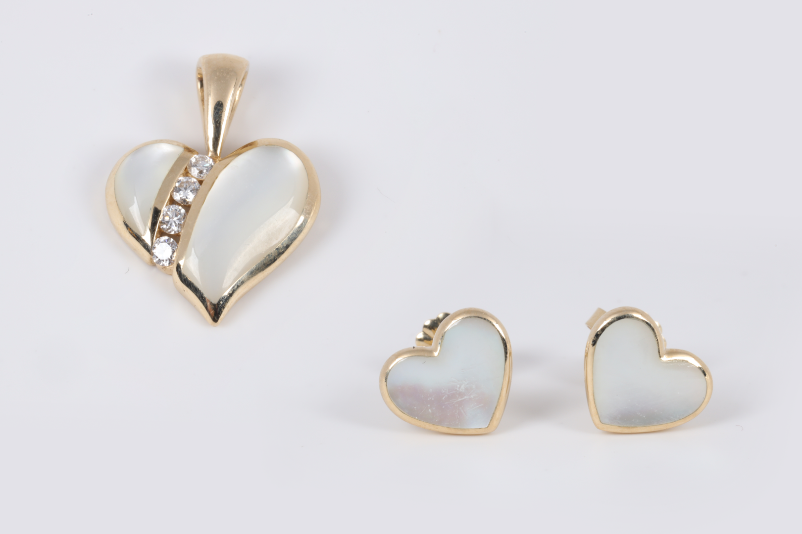 Kabana 14k Gold Diamond & Mother of Pearl Heart Pendant & Earrings Set (4.28g.)