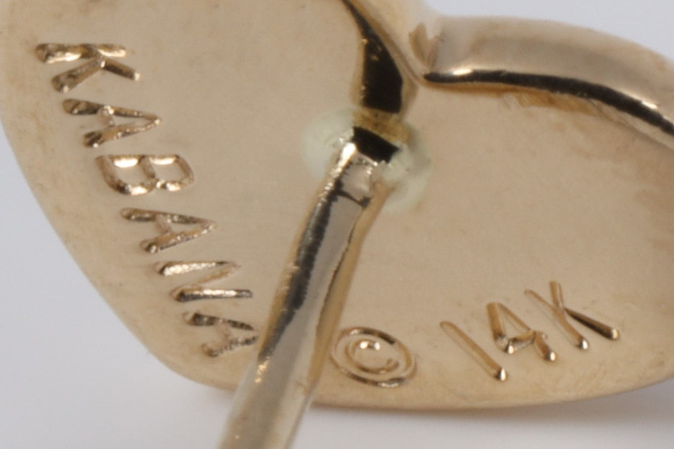 This elegant heart-shaped pendant and earrings set from Kabana is crafted in 14k yellow gold and features white mother of pearl inlay accented by sparkling round brilliant diamonds. The pendant measures 19mm in length and is paired with matching earrings secured by push backs. Each piece is engraved with the "Kabana" signature, and the set remains in excellent original condition with no damage or alterations. A refined and feminine design, ideal for collectors or daily wear.
