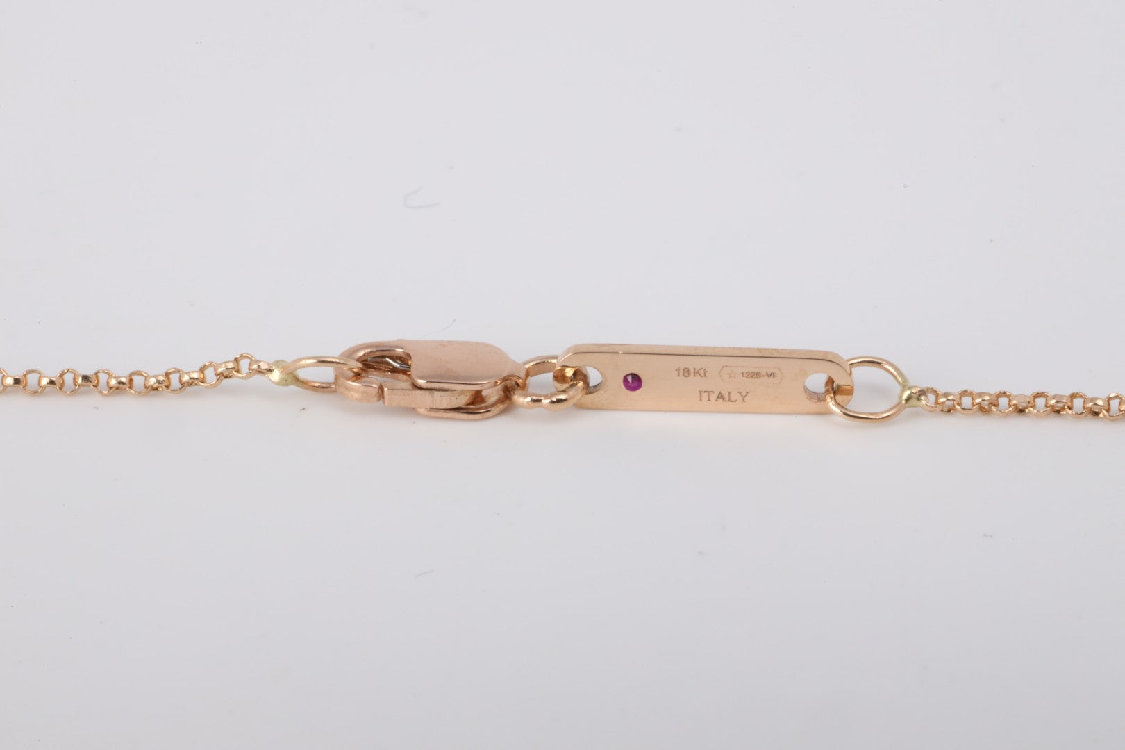 This refined tube pendant necklace from Roberto Coin’s Dolcetto collection is crafted in 18k rose gold and weighs 3.44 grams. Professionally authenticated and engraved with “Roberto Coin” and “Italy,” the necklace includes hallmark stamps “750,” “18Kt,” and “1226-VI.” It features a sculpted tube pendant on an adjustable 16.5–18 inch chain and is secured with a lobster clasp. Originally retailing for $1,530, this piece exemplifies understated elegance and Italian design.