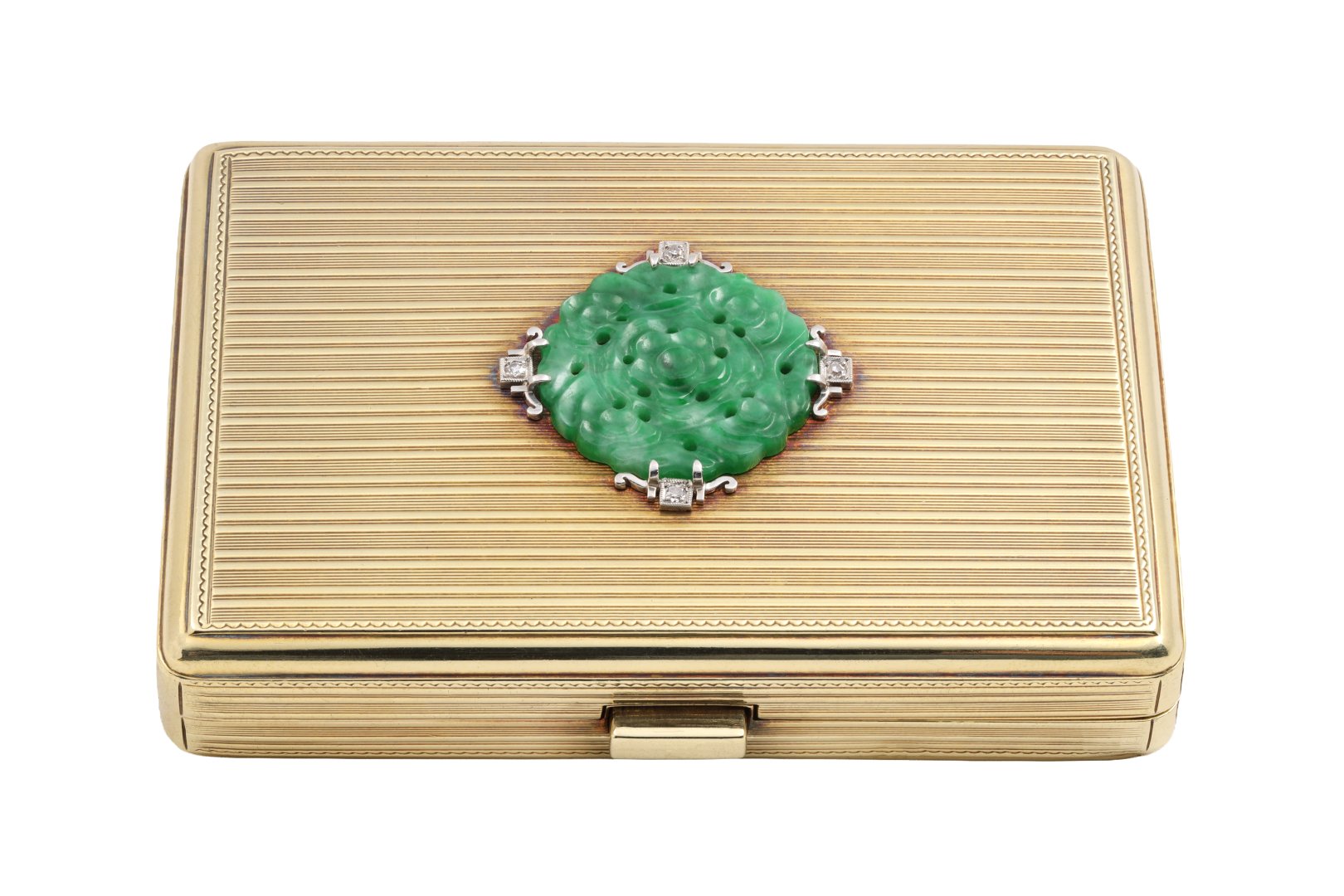 Accented with four single cut diamonds totaling approximately 0.06 carats, the compact offers a subtle touch of brilliance. At its center, a beautifully carved green jade gemstone in a florette cut adds a distinctive pop of color, enhancing the piece’s refined and artistic appeal.