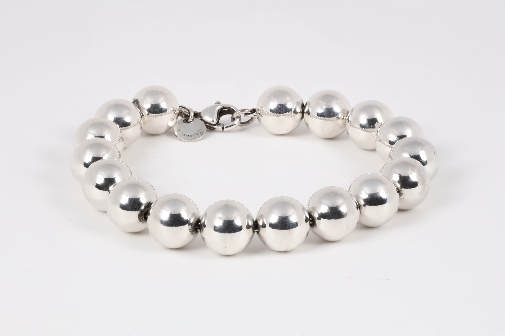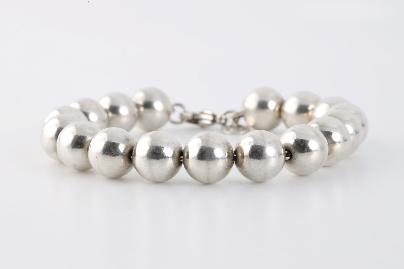 A bold expression of Tiffany’s modern design language, this HardWear ball bracelet features polished 10mm sterling silver spheres that exude confidence and style. Retailing for $700, it measures 7.5 inches in length and weighs 19.00 grams, offering a substantial feel on the wrist. Stamped “925” and inscribed “Tiffany & Co.,” this bracelet makes a statement on its own and pairs seamlessly with other Tiffany HardWear or classic chain designs.
