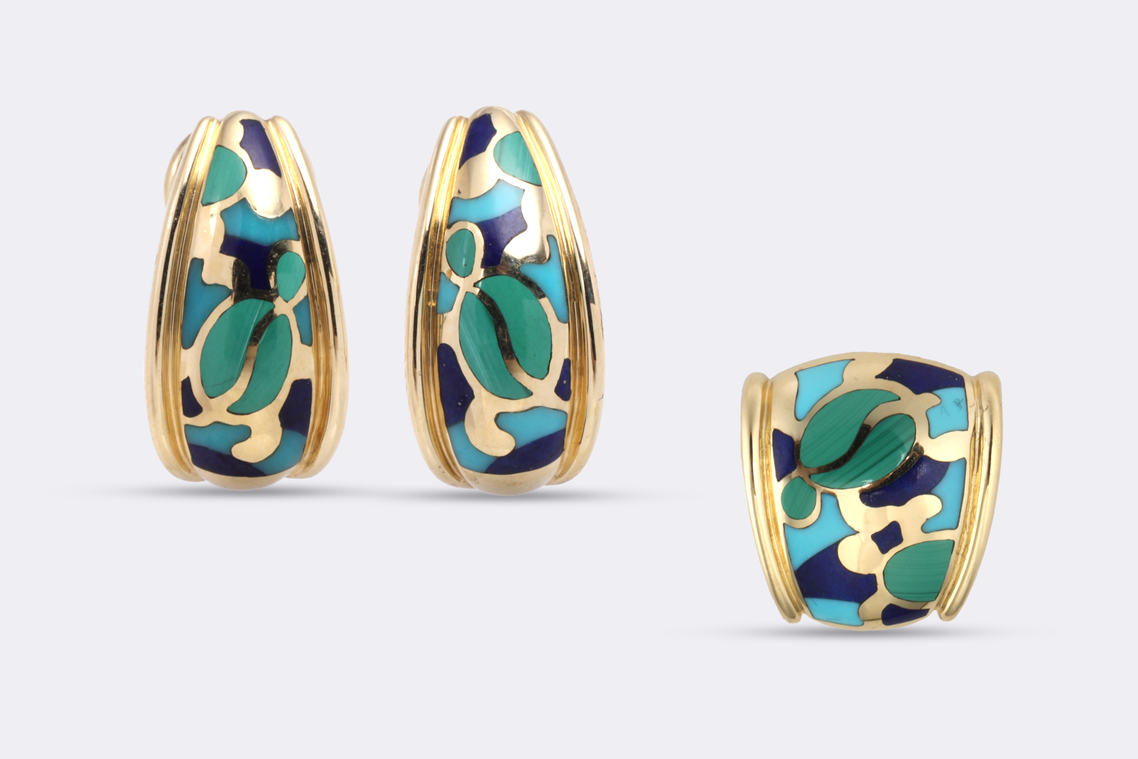 This exquisite set from Na Hoku features earrings and a pendant, each beautifully crafted from 14k yellow gold. The pieces are adorned with inlays of vibrant Malachite, Turquoise, and Lapis Lazuli adding a touch of color and elegance to the design.