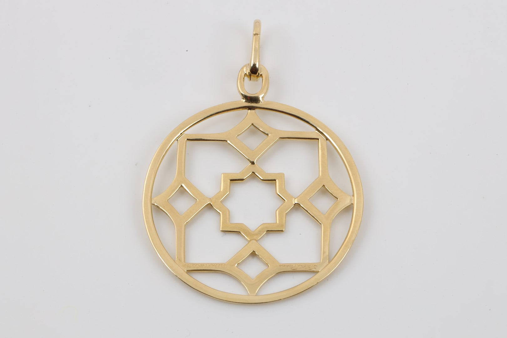 This bold medallion pendant from Tiffany & Co.’s Paloma Picasso Zellige collection is crafted from 18k yellow gold and weighs 9.09 grams. Featuring a Moroccan-inspired geometric design, the piece is marked with maker’s marks and stamped “750.” A striking statement pendant with iconic design heritage.