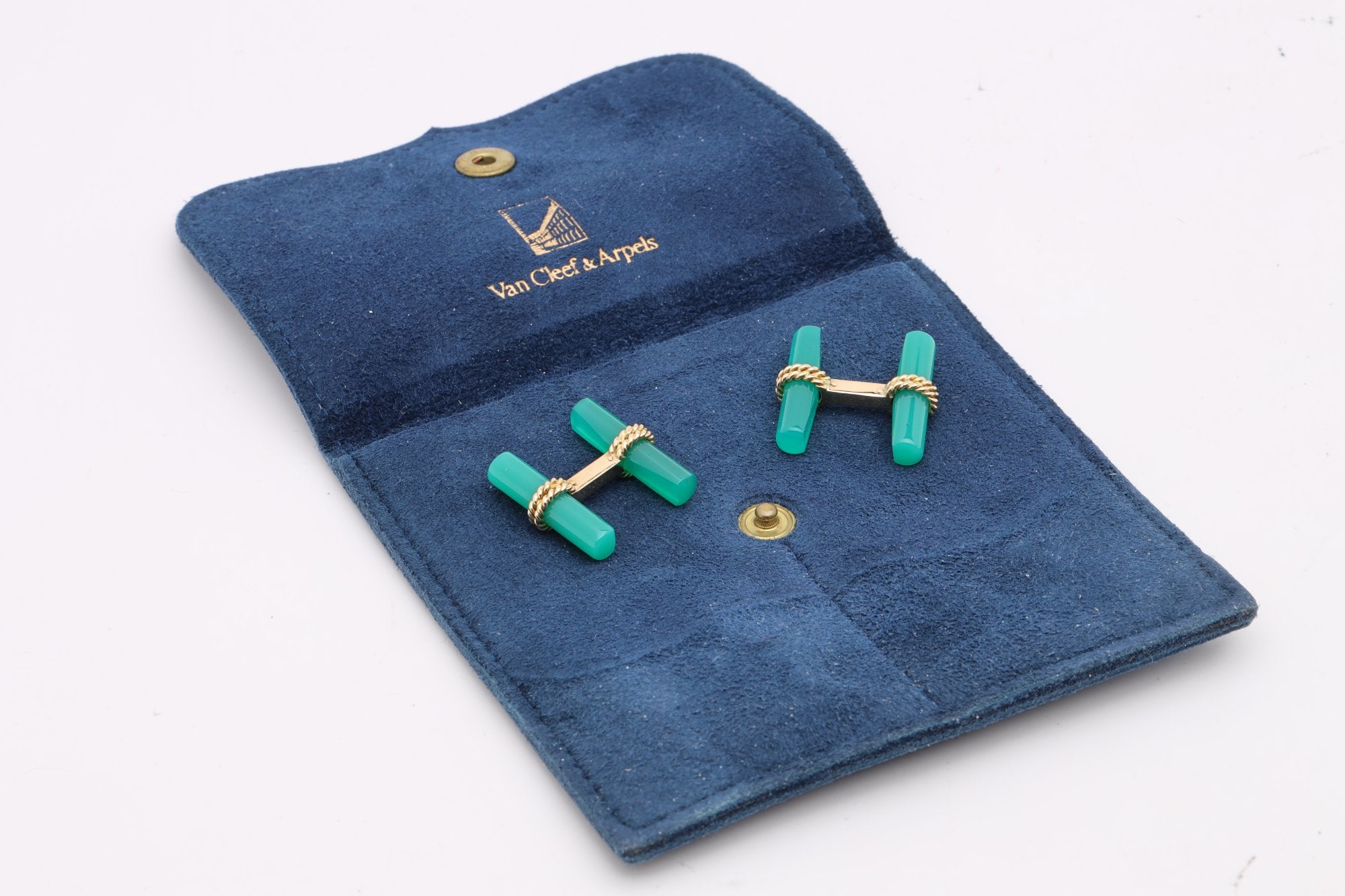 The clean, geometric lines of the chrysoprase paired with the warm gold setting create a sophisticated balance of color and form, making these cuff links a timeless accessory for formal wear. Signed “VCA” along with a serial number, they reflect the heritage and precision associated with one of the world’s most prestigious jewelry houses.