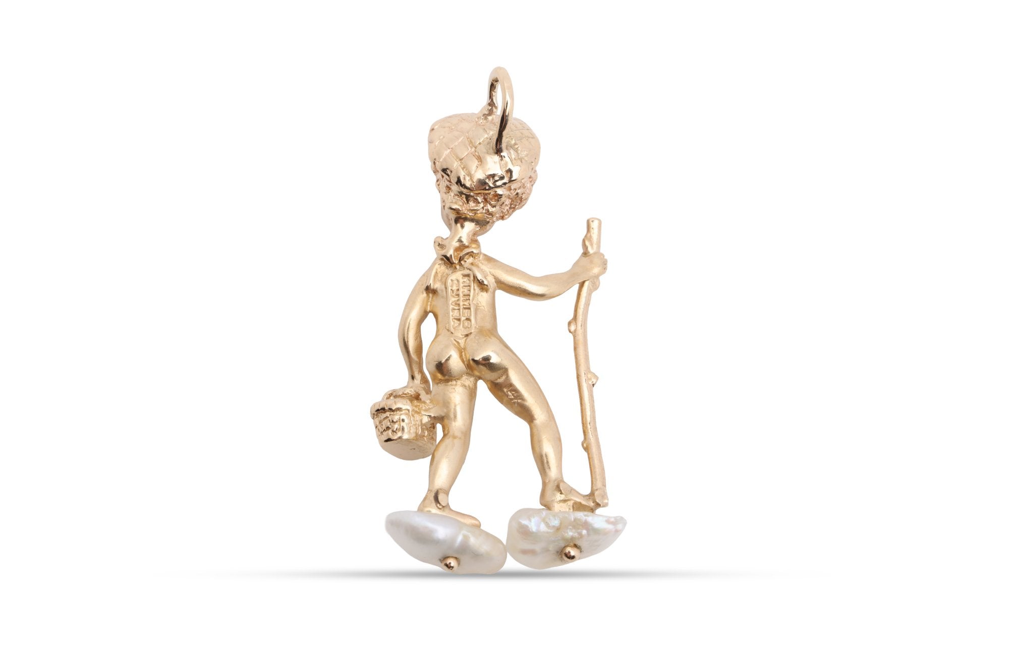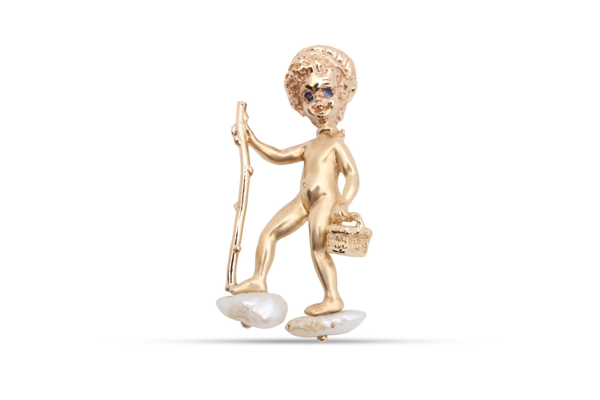 This exquisite pendant by Marvin Hime with Cyril and Vera Wood is a testament to the designers' craftsmanship. The pendant is crafted from 14k yellow gold and features a charming angel motif. The angel is adorned with two round-cut sapphires and a pearl, adding a touch of elegance and sophistication.