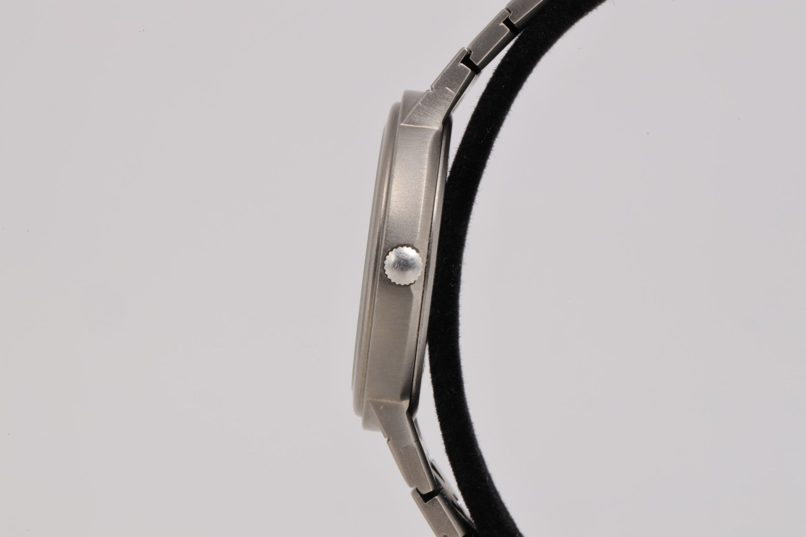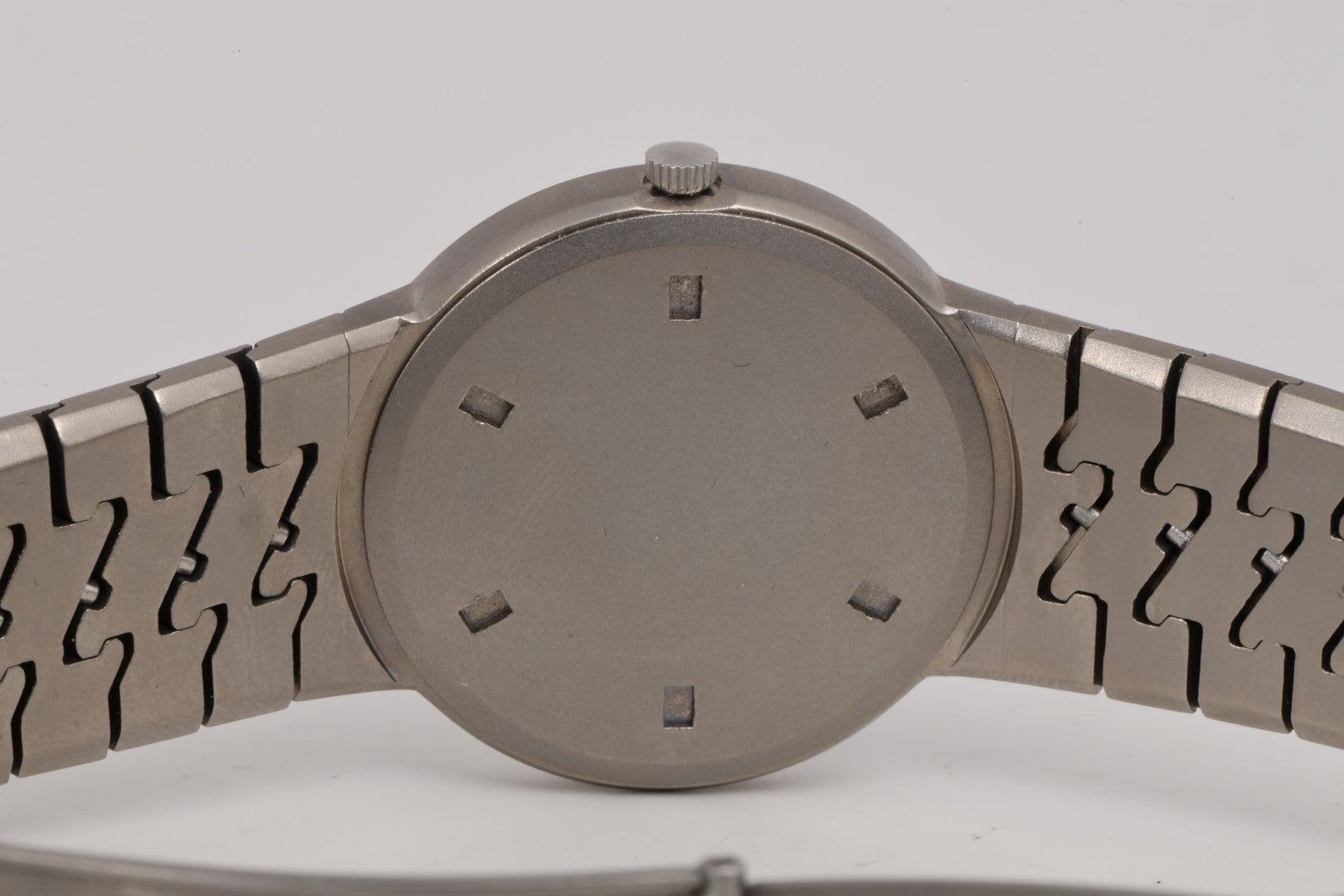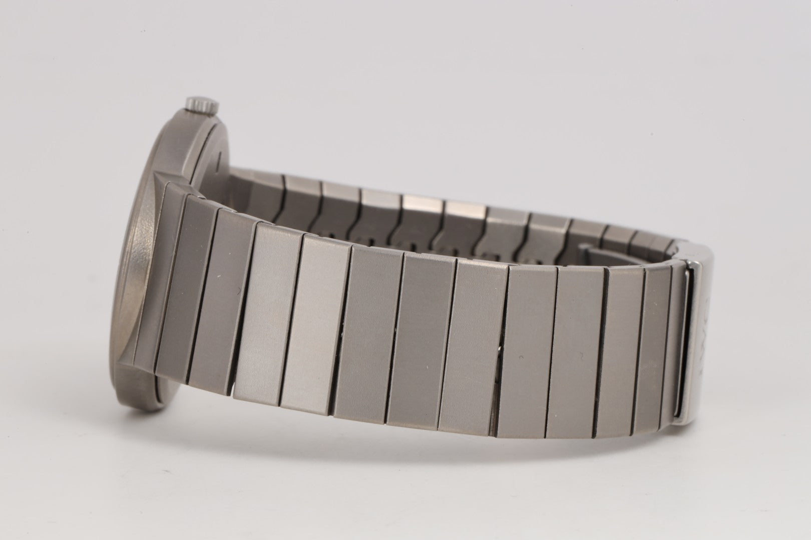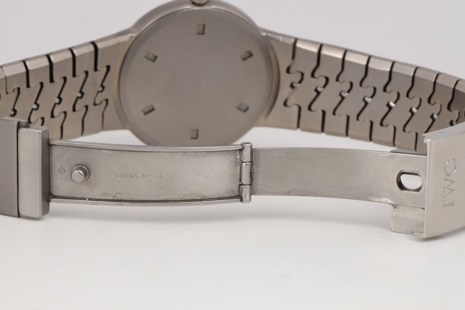 The IWC SL Design 3317 is a refined example of minimalist luxury and engineering precision. Crafted in Switzerland, this men's watch features a 32mm titanium case and matching bracelet, making it exceptionally lightweight yet durable. Powered by a quartz movement, it delivers accurate timekeeping with hour, minute, second, and date functions. The watch is secured by a fold clasp and fits wrists up to 6.75". A sleek choice for those who appreciate understated design.