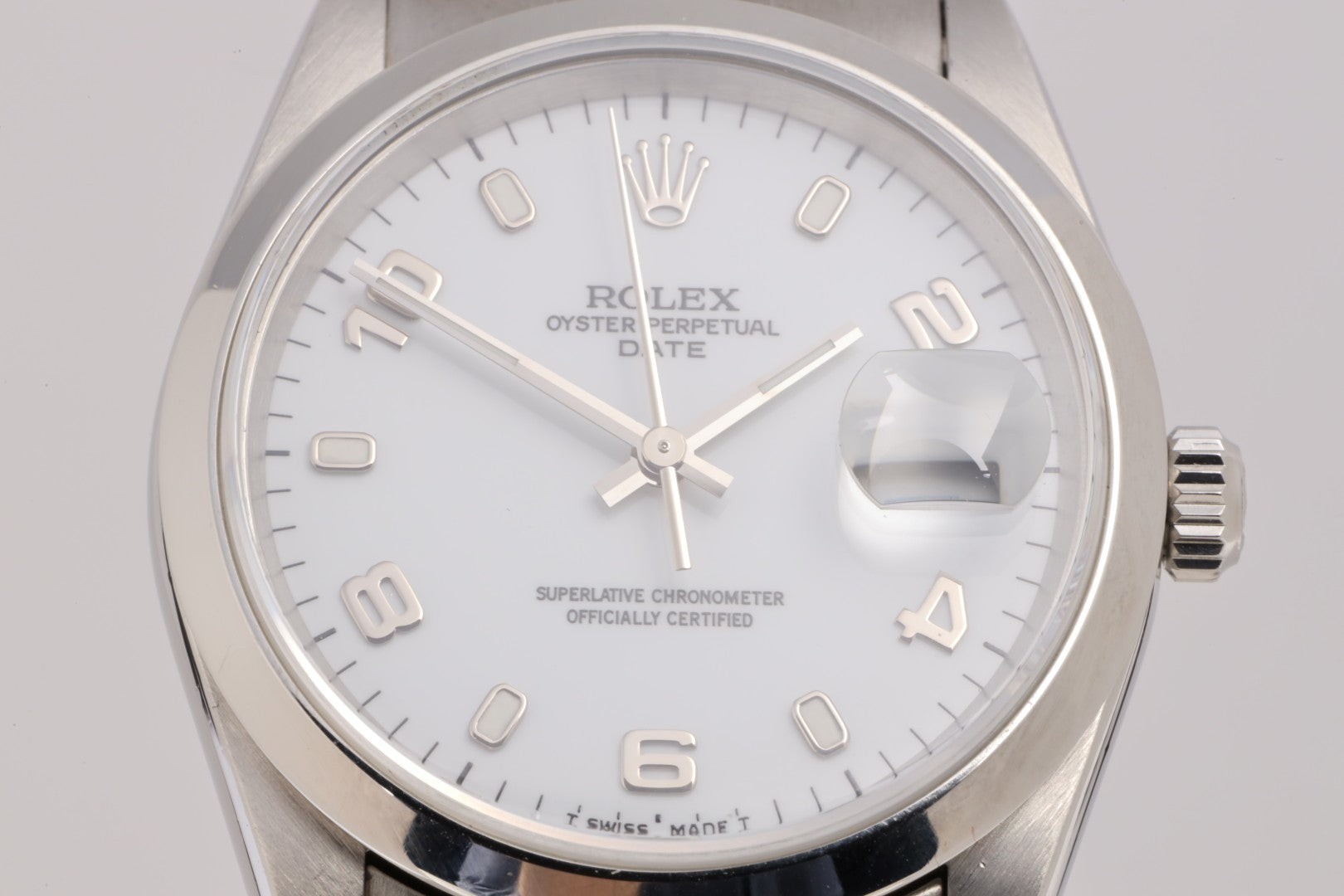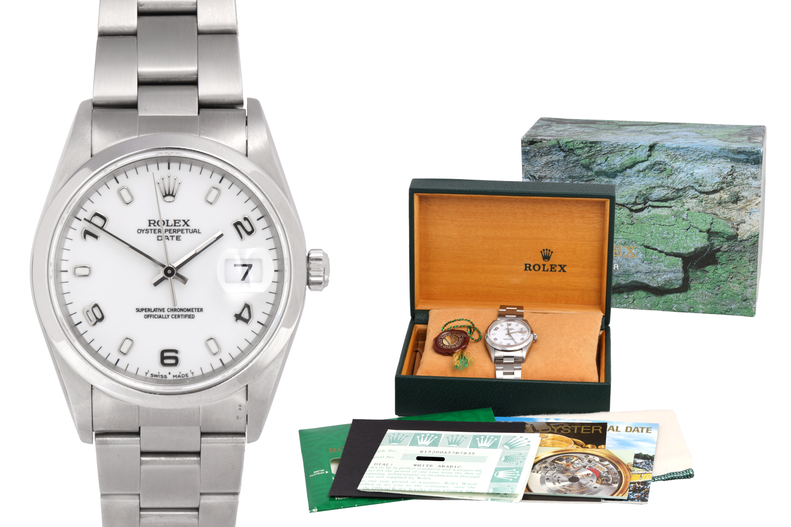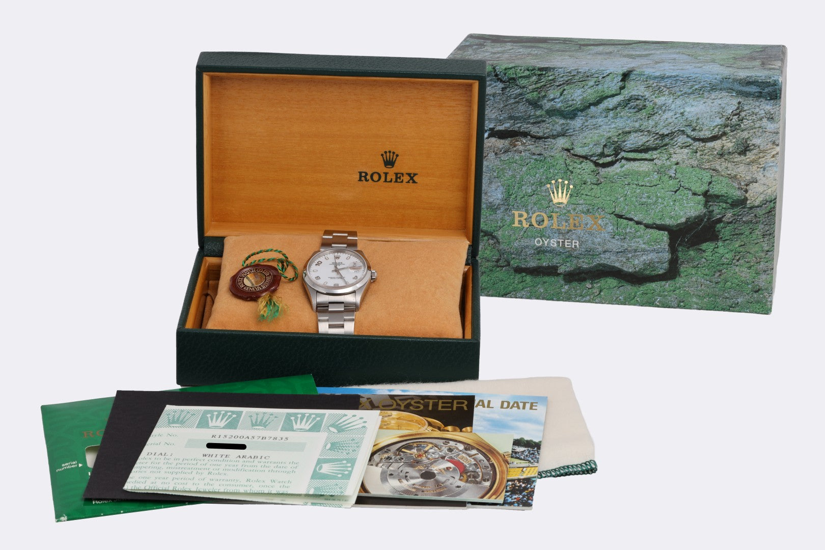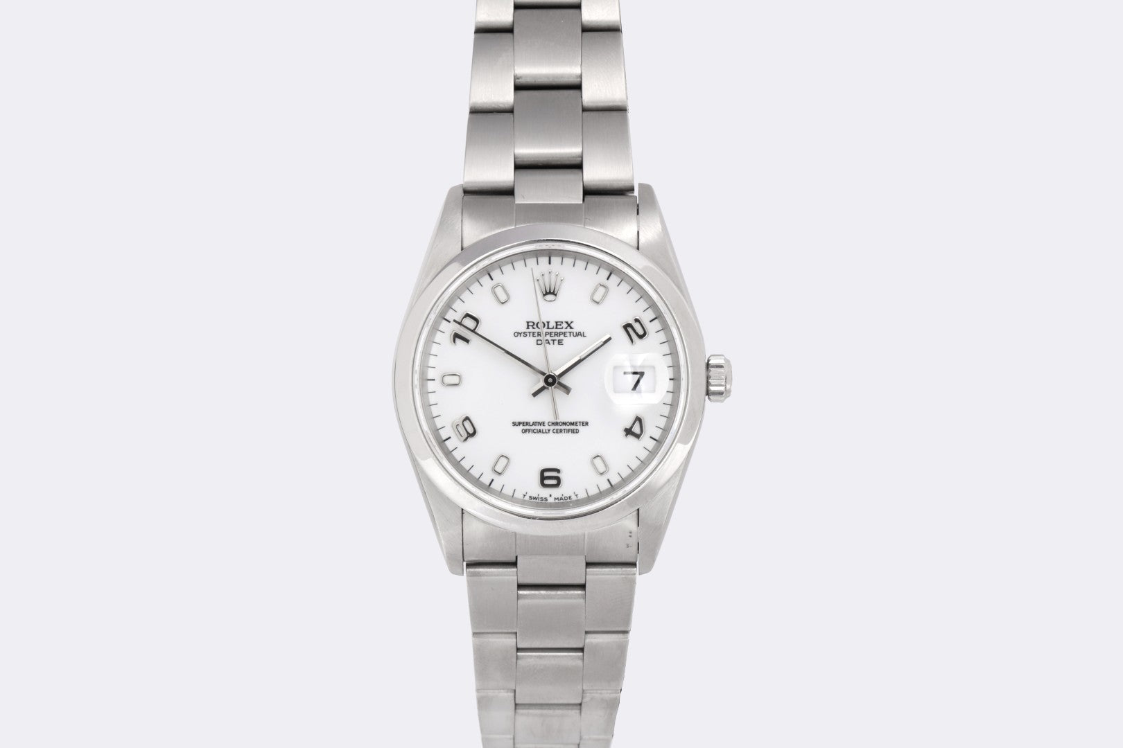The Rolex Oyster Perpetual Date 15200 blends timeless design with everyday versatility. This 34mm stainless steel example from 1997 features a smooth fixed bezel, sapphire crystal, and a rare white Arabic dial with baton markers on alternating hours, giving the piece a distinctive and highly legible aesthetic. Powered by the automatic caliber 3135 movement with a 48-hour power reserve, it delivers precision timekeeping with date functionality. Recently serviced (9/2/2025), this watch is offered complete with box and papers, making it a strong addition for collectors.