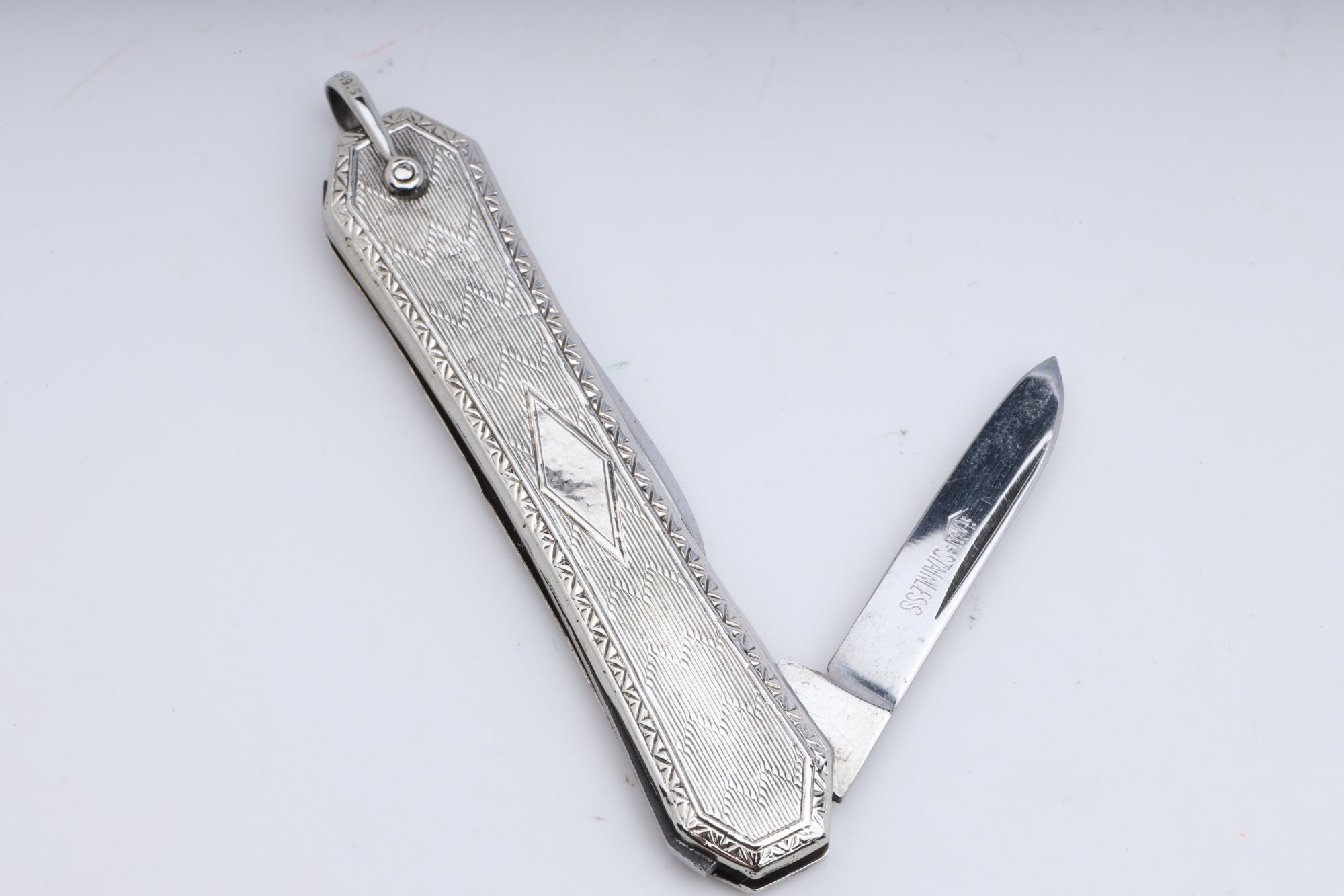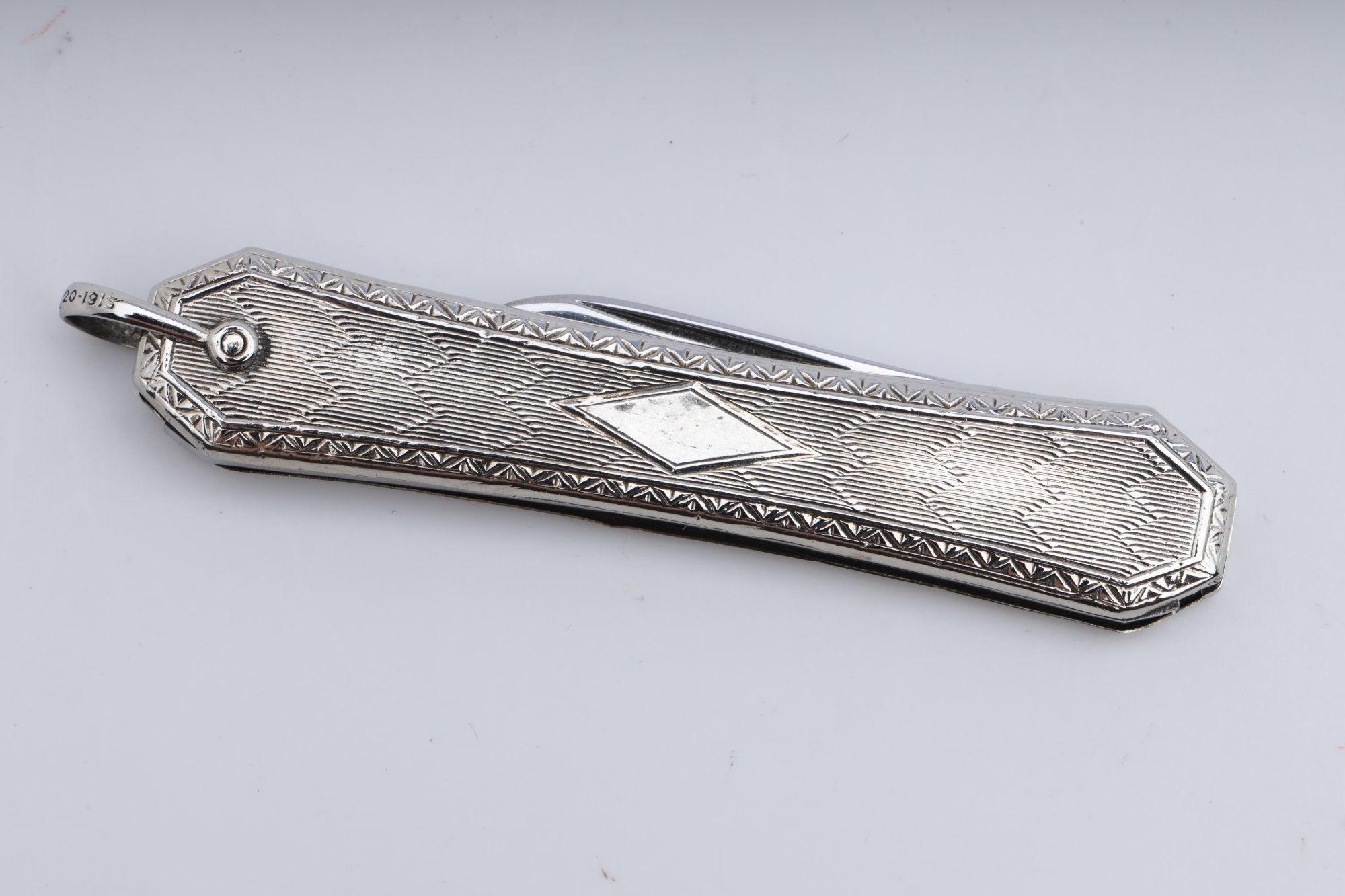 This antique pocket knife is a unique piece of history, crafted from 10k white gold in a textured chevron style. The knife features two blades, each with its own distinct dimensions, adding to its versatility and appeal.