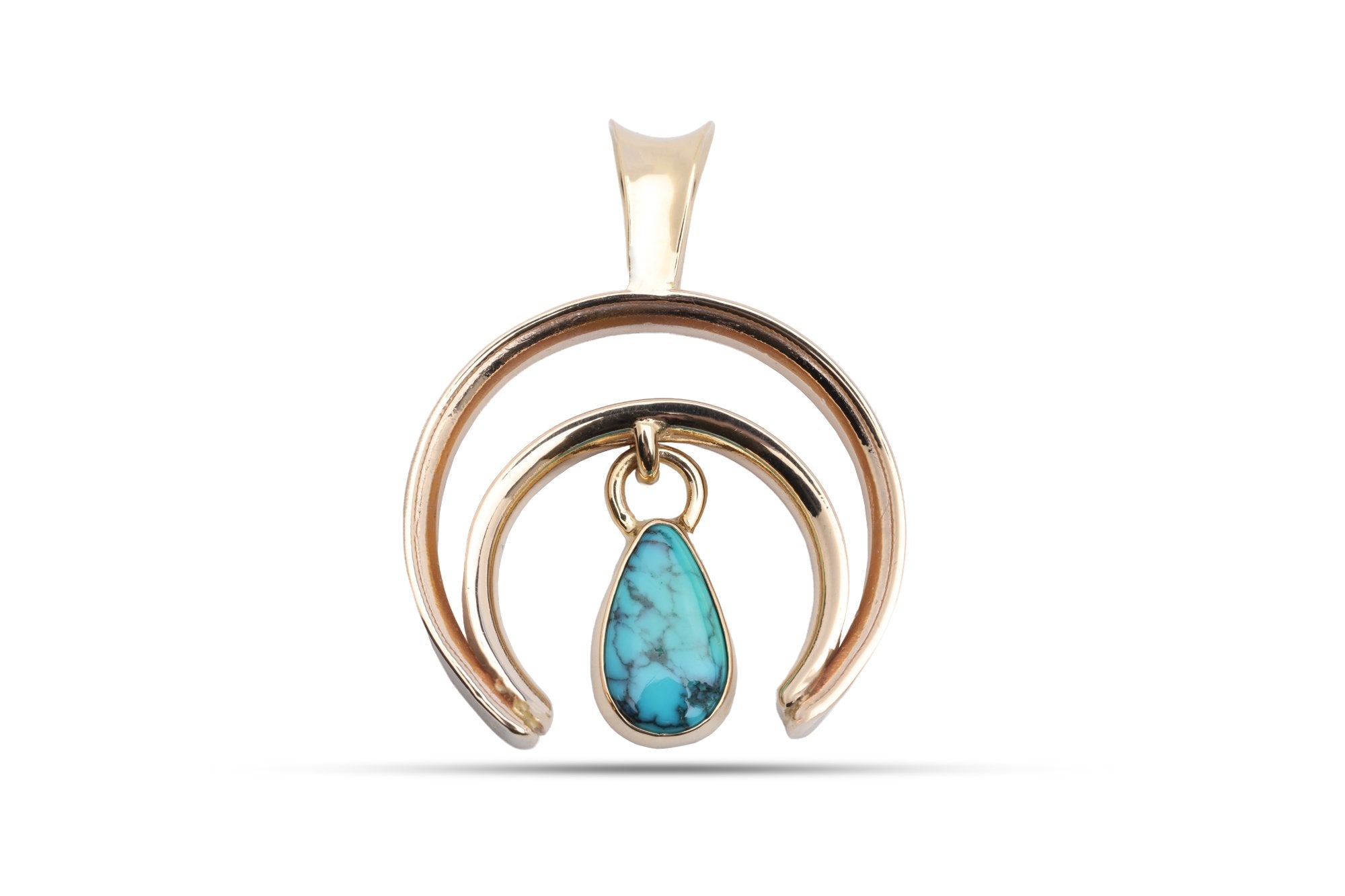 This pendant is a beautiful piece of jewelry, crafted from yellow gold and featuring a stunning pear cut turquoise gemstone. The gemstone, weighing 2.44ctw, is set in a crescent moon design, making this pendant a unique and eye-catching accessory.