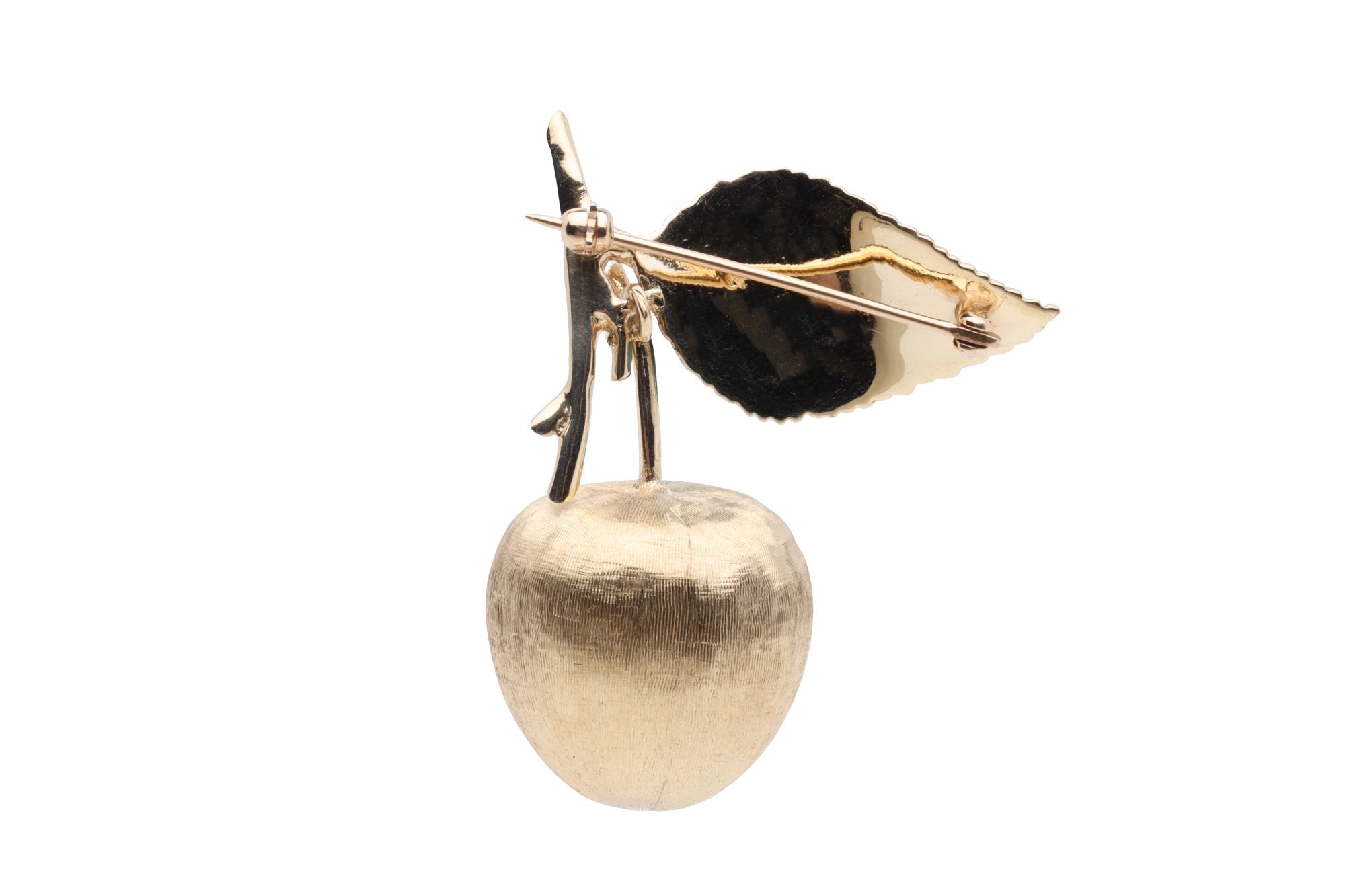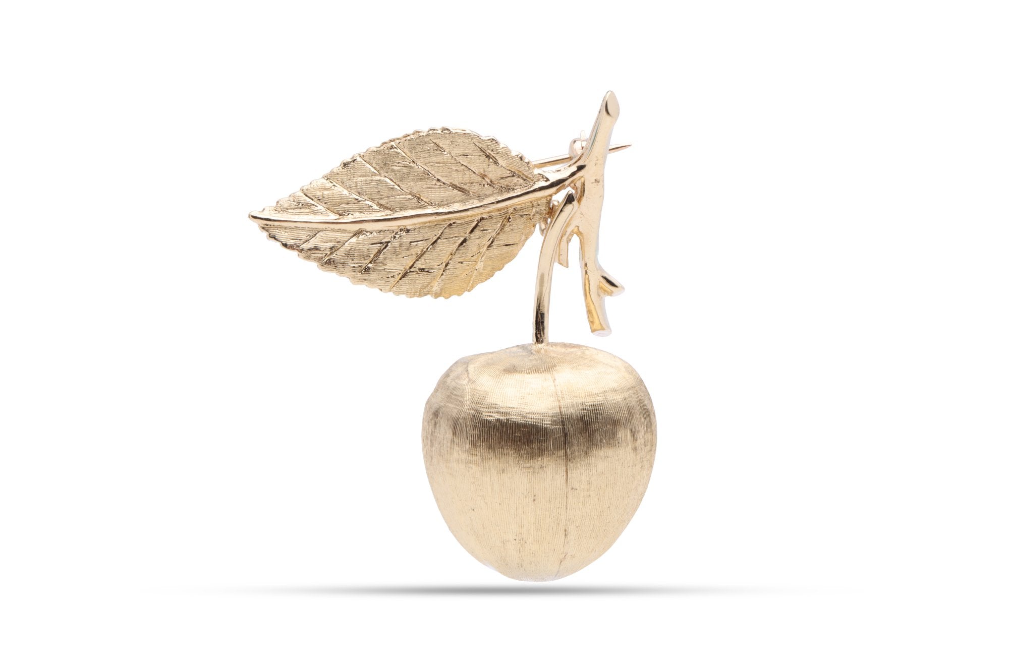This unique piece is a 14k Yellow Gold Apple Brooch, a charming addition to any jewelry collection. The brooch is crafted from yellow gold, showcasing a delightful apple design that is sure to catch the eye.
